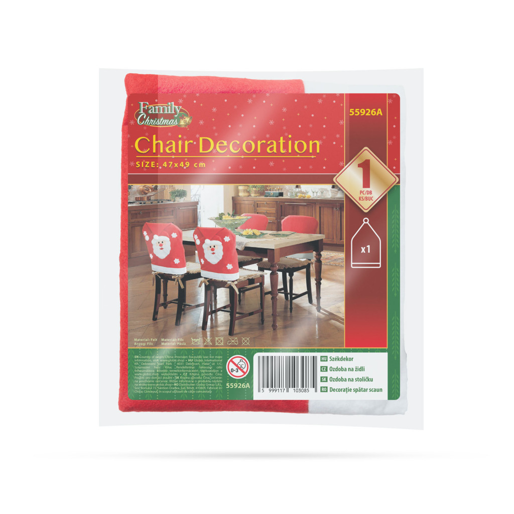 Mikulássapka formájú, domború mikulás mintával ellátott székdekoráció az ünnepekre.