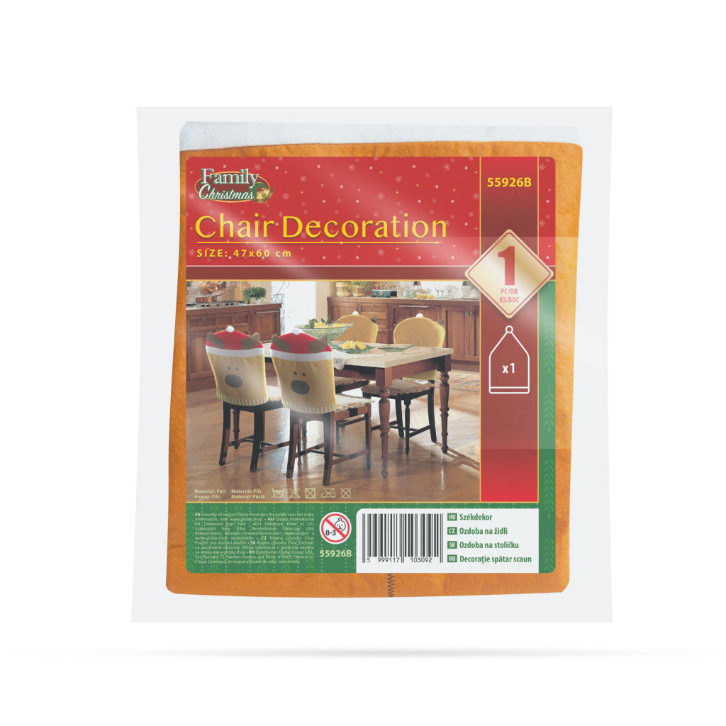 Domború, filcből készült, rénszarvas mintával ellátott székdekoráció az ünnepekre.