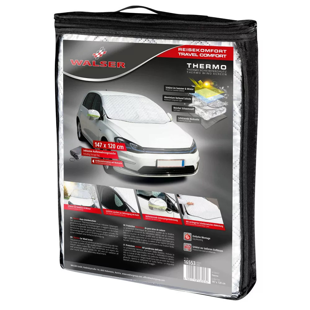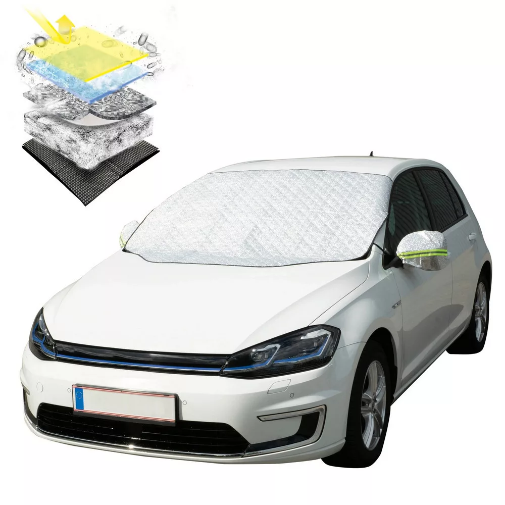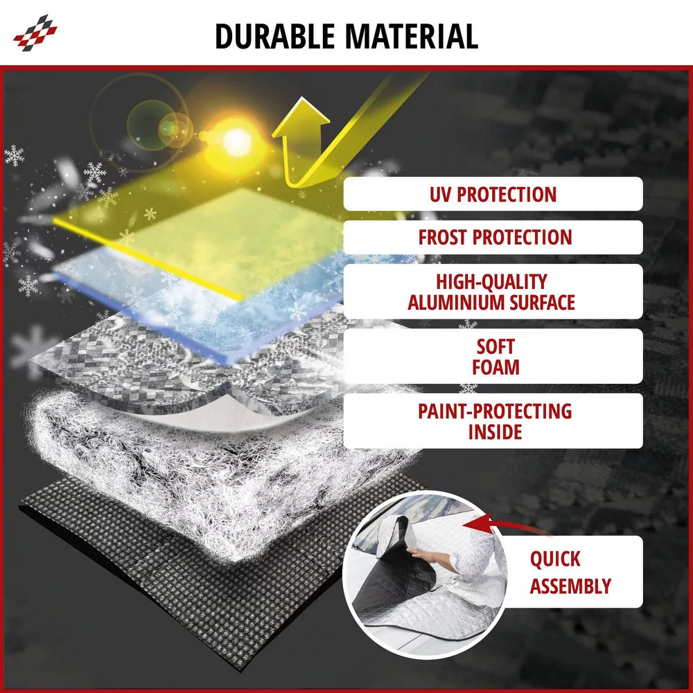 Autója egész évben ki van szolgáltatva az időjárásnak. A szélvédő és az oldalsó tükrök különösen igénybe veszik, és sokat kell bírniuk. A hővédő szélvédővédő kiváló minőségű 4 rétegű kompozit anyagból készült, strapabíró és tartós. A külső alumíniumréteg optimálisan visszaveri az UV-sugarakat, hogy csökkentse az autó felmelegedését nyáron. Ezenkívül az ablaktörlők is védve vannak a nap káros hatásaitól, ezáltal lényegesen hosszabb lesz az élettartamuk.