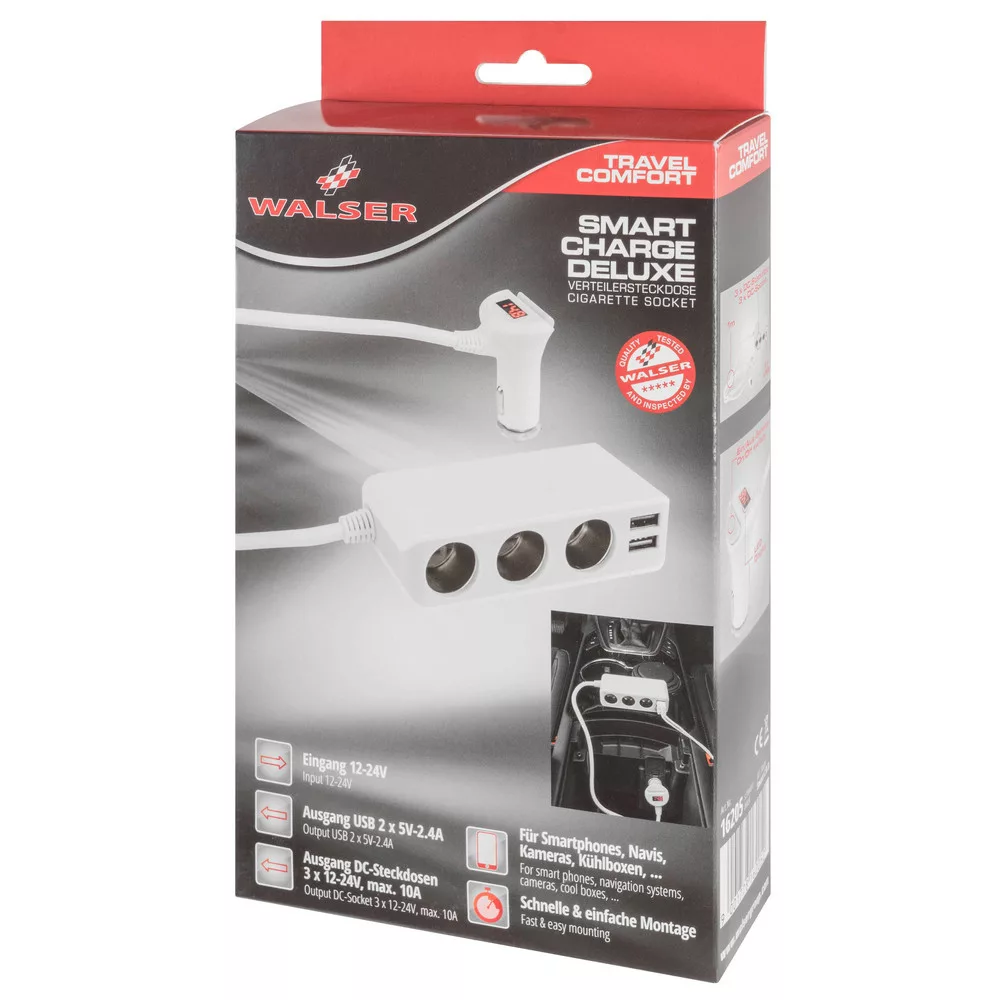 A Smart Charge Deluxe többportos adapter három egyenáramú kimenettel rendelkezik 12-24 voltos és maximum 10 amperes, valamint két további USB-kimenettel 5 V-os, 2,4 amperes feszültséghez. Ennek eredményeképpen számos elektronikus eszköz tölthet fel vezetés közben, készenlétben tarthatja azokat érkezéskor.