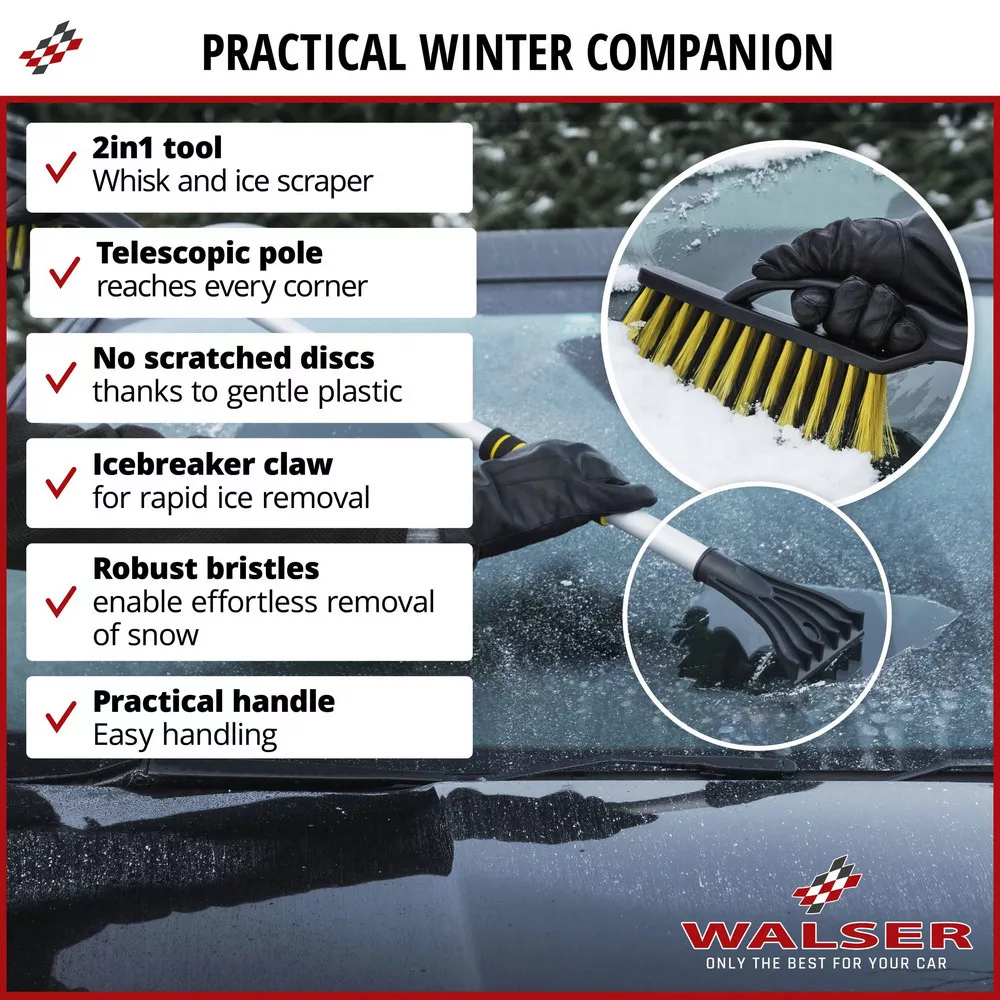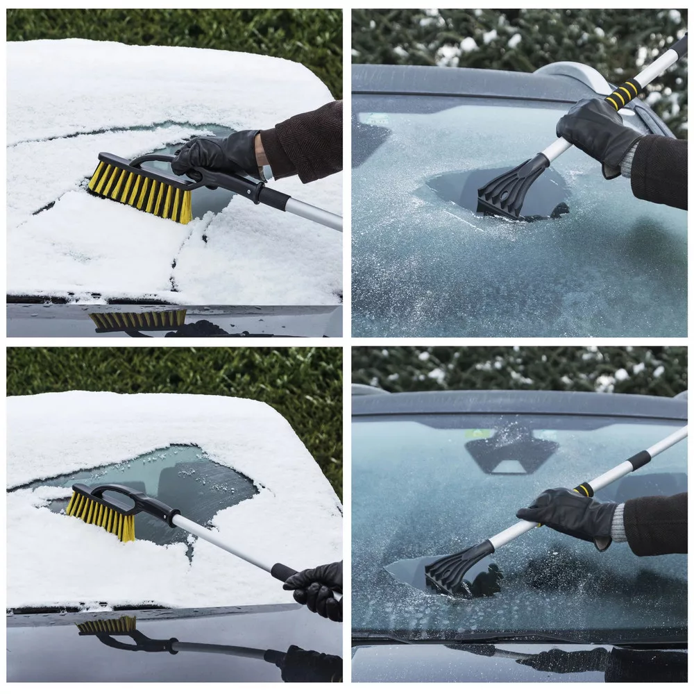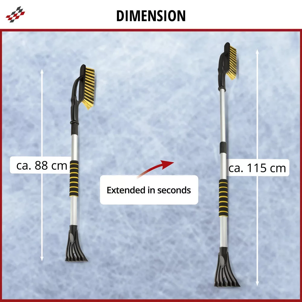 A termék kiváló minőségű és tartós anyagból készült. Az egyik oldalon egy jégkaparó található, amely jégtörő karmokkal rendelkezik, lehetővé téve a jég gyors és hatékony eltávolítását. A termék másik oldalán egy erős sörtéjű kefe található, amellyel gyorsan megtisztíthatja autója ablakait a szennyeződésektől. Ezenkívül a tisztítóeszköz teleszkópos fogantyúval rendelkezik, az alkalmazástól függően 88 és 115 cm közötti hosszra állítható. Így az autó minden ablakfelülete könnyen elérhető a nehezen megközelíthető helyekről, például a szélvédő közepéről.