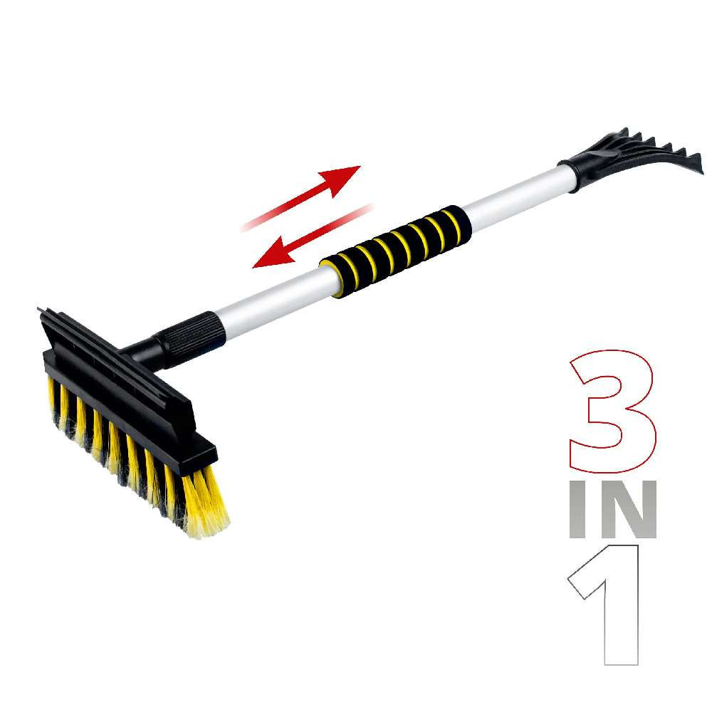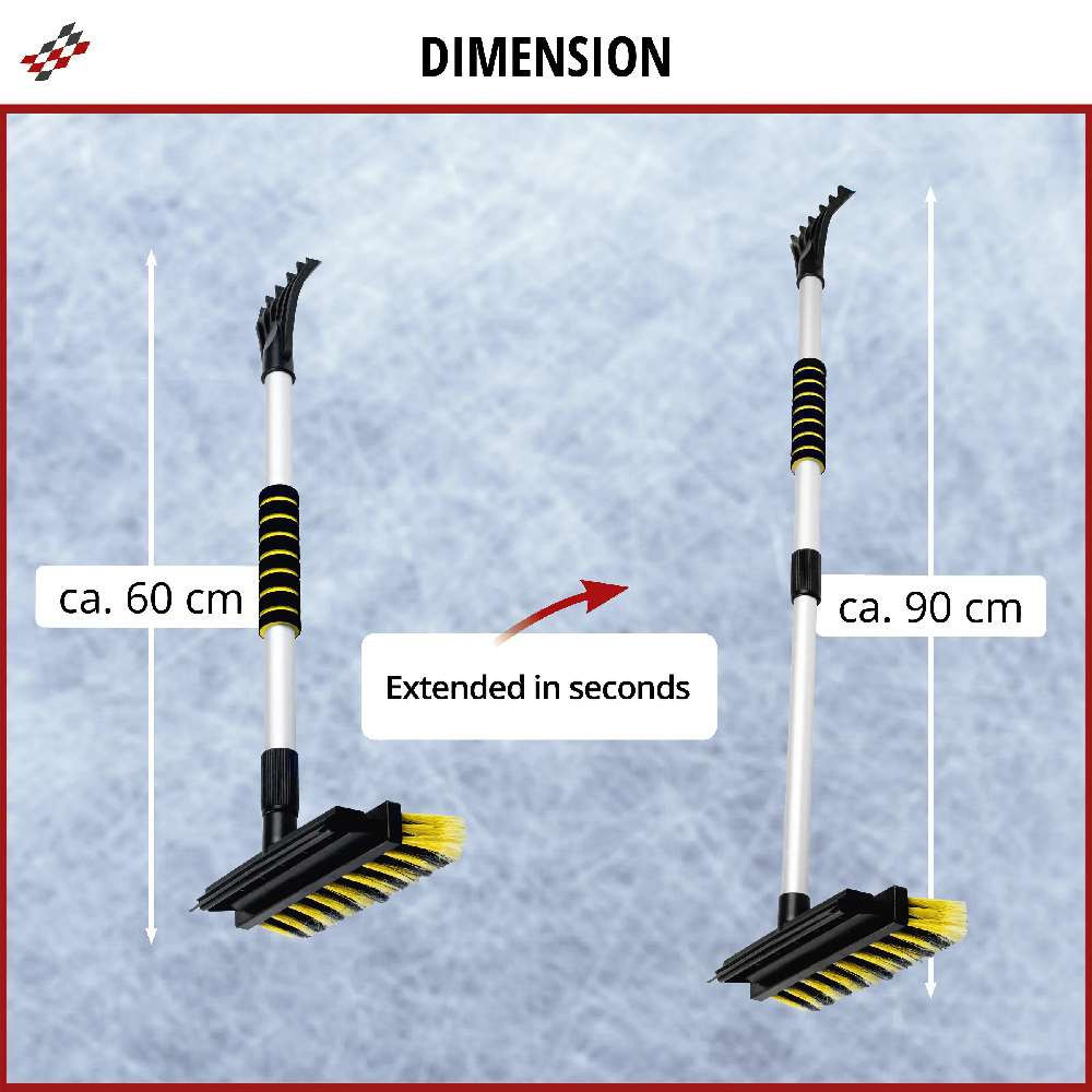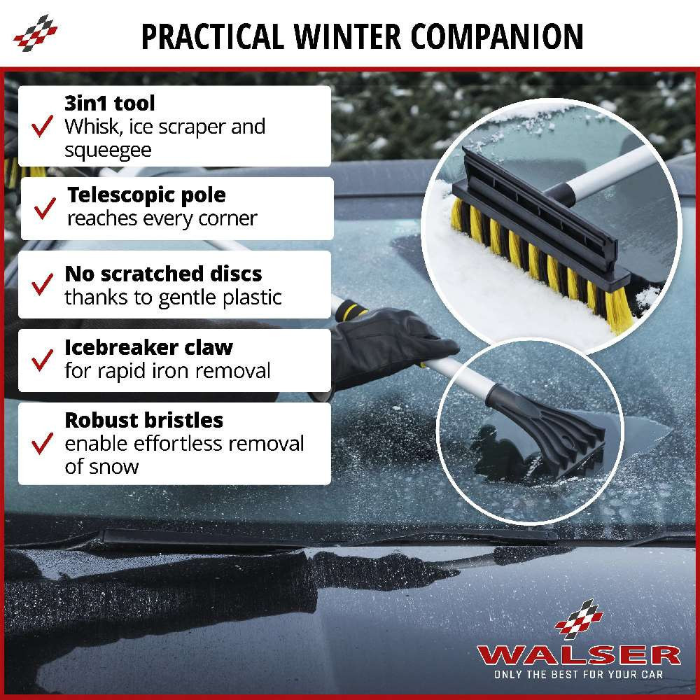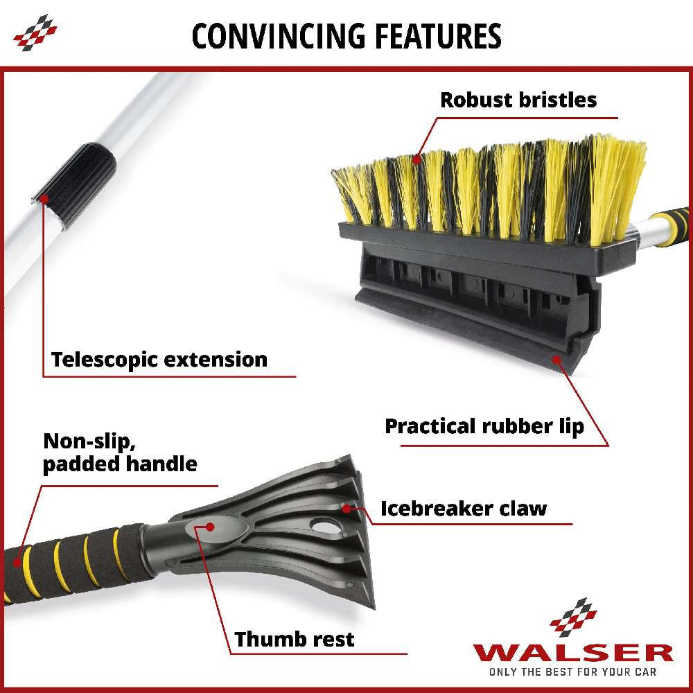 A termék kiváló minőségű és tartós anyagból készült. Az egyik oldalon egy jégkaparó található, amely jégtörő karmokkal rendelkezik, amelyek lehetővé teszik a jég gyors eltávolítását. A termék másik oldalán egy erős sörtéjű kefe található, amellyel gyorsan megtisztíthatja autója ablakait a szennyeződésektől, és a gumilehóval csíkmentesen törölheti a felesleges vizet. Ezenkívül a tisztítóeszköz teleszkópos fogantyúval rendelkezik, és az alkalmazástól függően 60 és 90 cm közötti hosszra állítható. Így az autó minden ablakfelülete könnyen megközelíthető, és a nehezen megközelíthető helyekről, például a szélvédő közepéről.