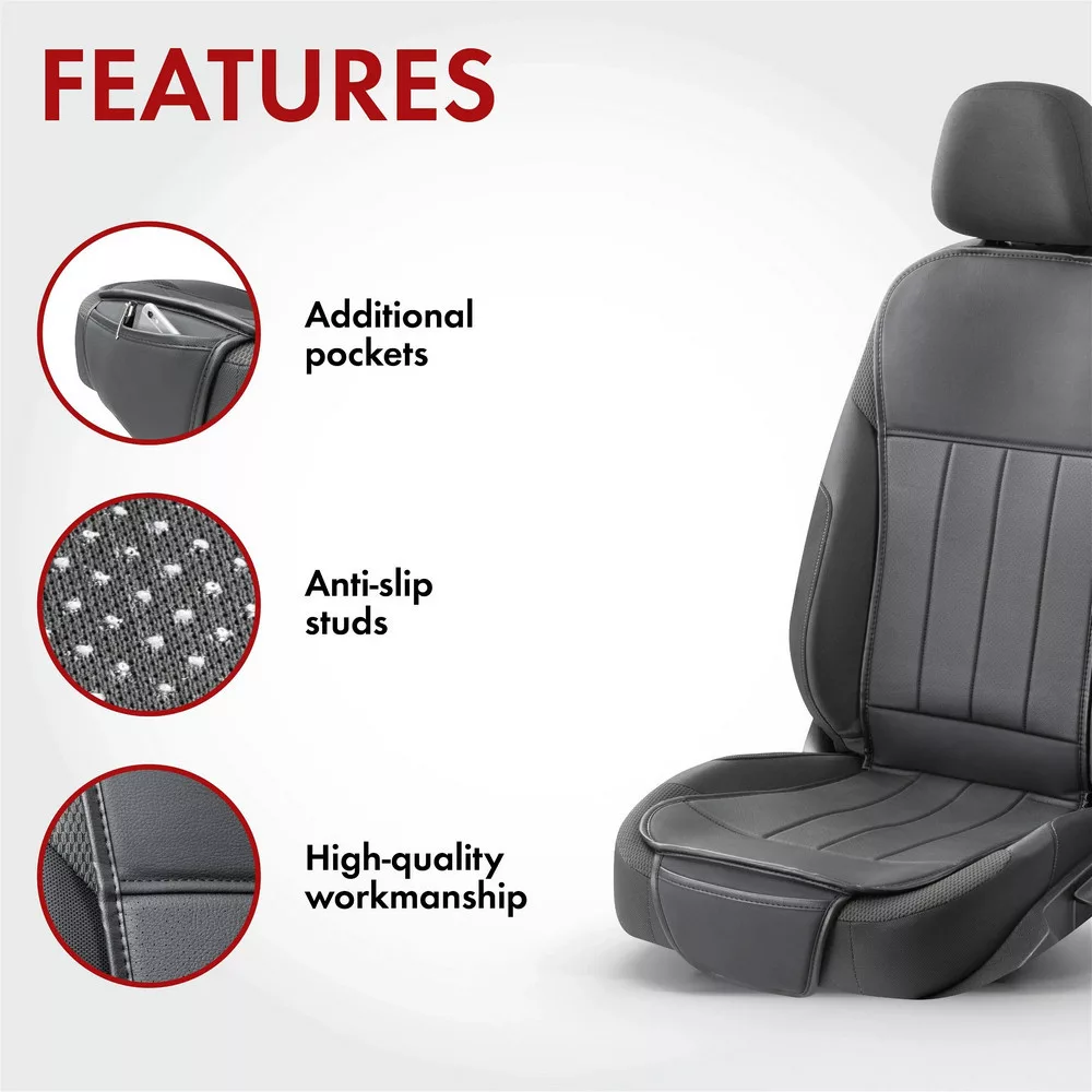 Ez a kiváló minőségű üléshuzat perforált szintetikus bőrből készült, hogy különleges megjelenést kölcsönözzen autójának. A finoman varrott szélek további sportos hatást ad a Lewis üléspárnának. Az elülső zseb extra tárhelyet biztosít okostelefonjának vagy fontos dokumentumoknak, amelyeket kéznél kell tartania. Ezen kívül a háttámla rögzítőfülekkel van felszerelve, így a Lewis üléshuzat a helyén marad.