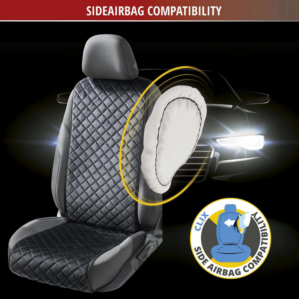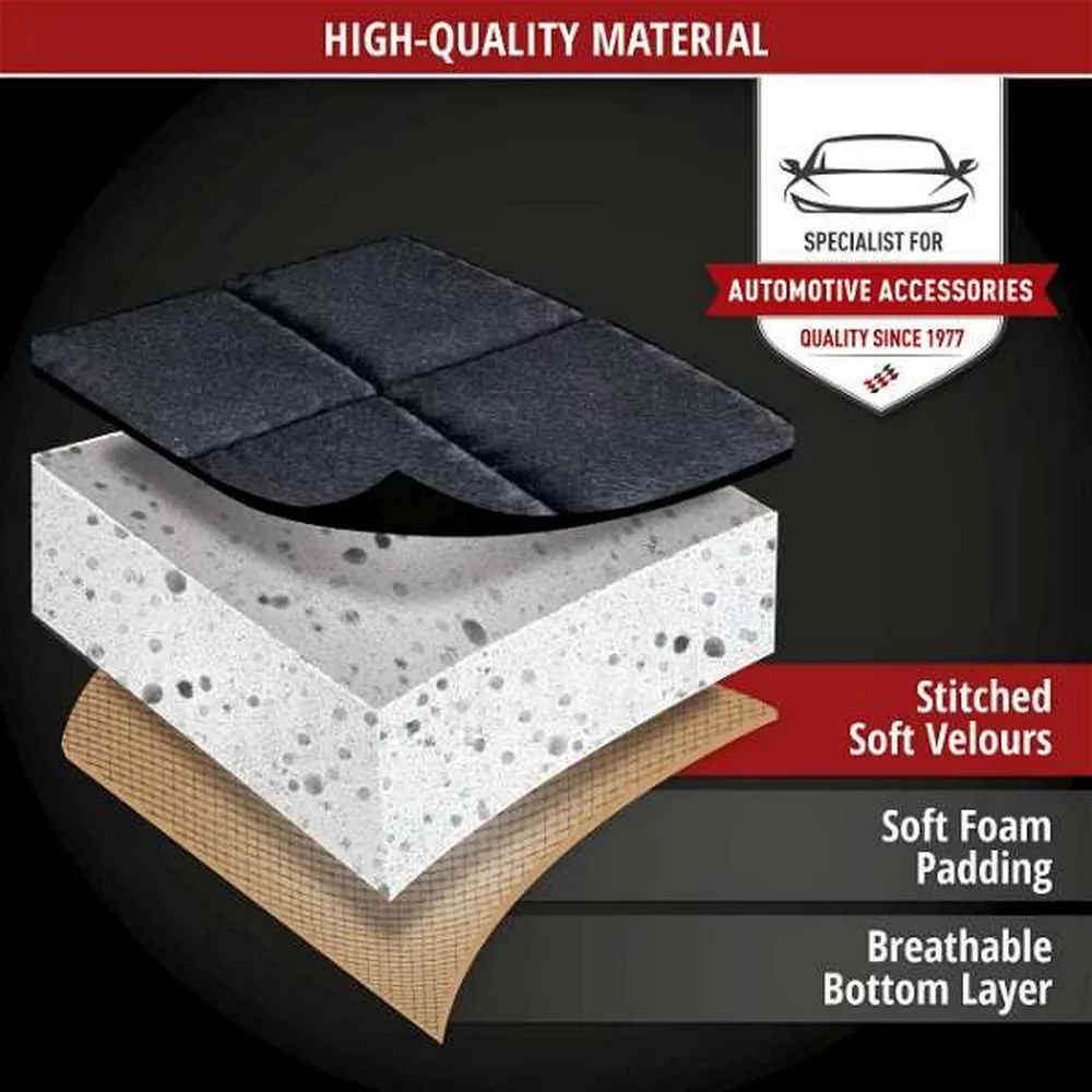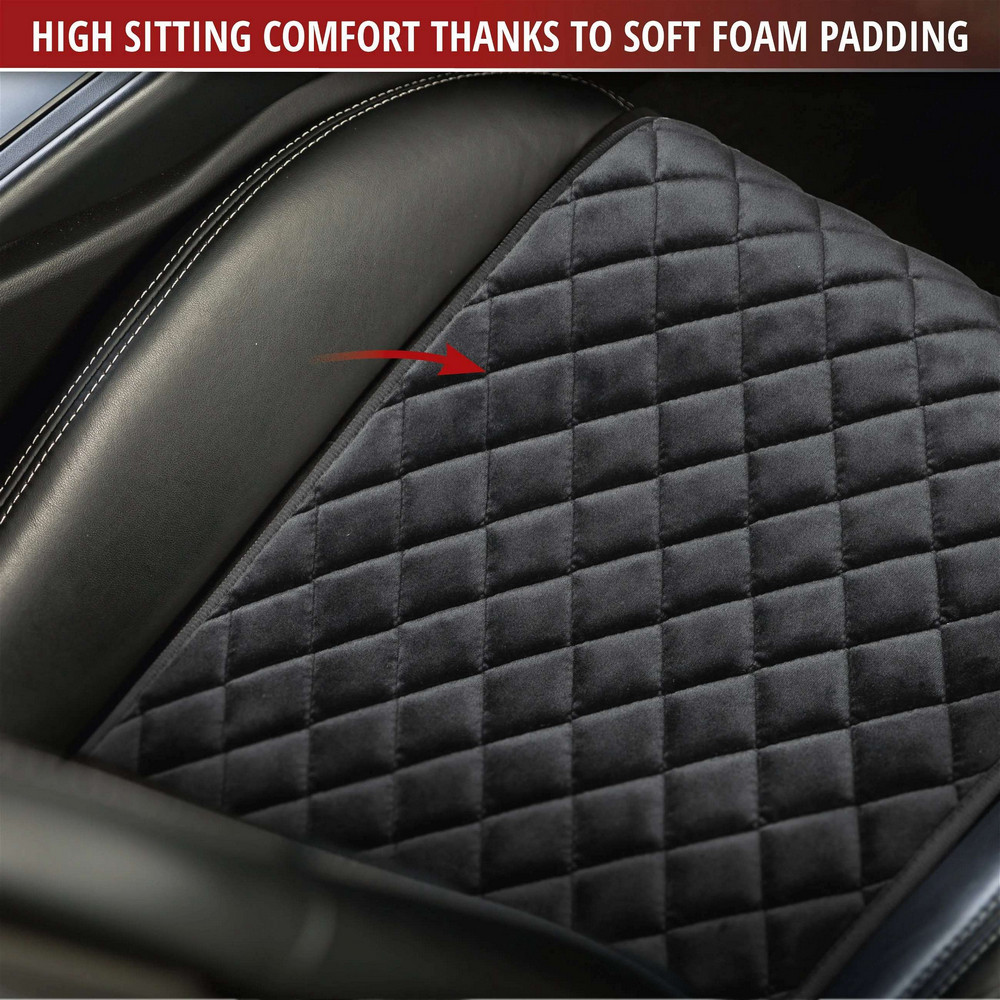 A fekete színű üléshuzat nemesen steppelt velúrból készült. Ez az anyag strapabíró, optimálisan védi az ülés és a háttámla felületét a kopástól, foltoktól, folyadékoktól és egyéb szennyeződésektől. Ugyanakkor a velúr üléshuzat kellemesen puhának érzi magát, és jól érzi magát. A 8 mm-es laminálás magas üléskényelmet és luxus vezetési élményt biztosít minden utazás során. Ezenkívül az üléspárna hátoldalát csúszásgátló bevonat borítja, amely megakadályozza a termék elcsúszását.