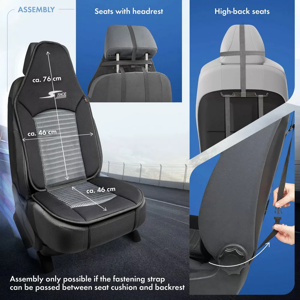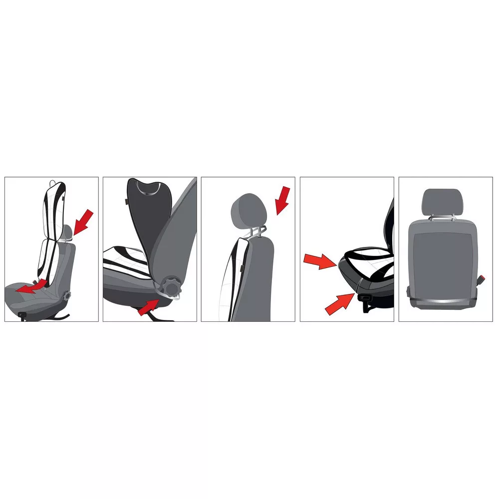 Rögzítése a fejtámlán, illetve gumipántokkal történik, oldallégzsákos ülésekhez is alkalmas.