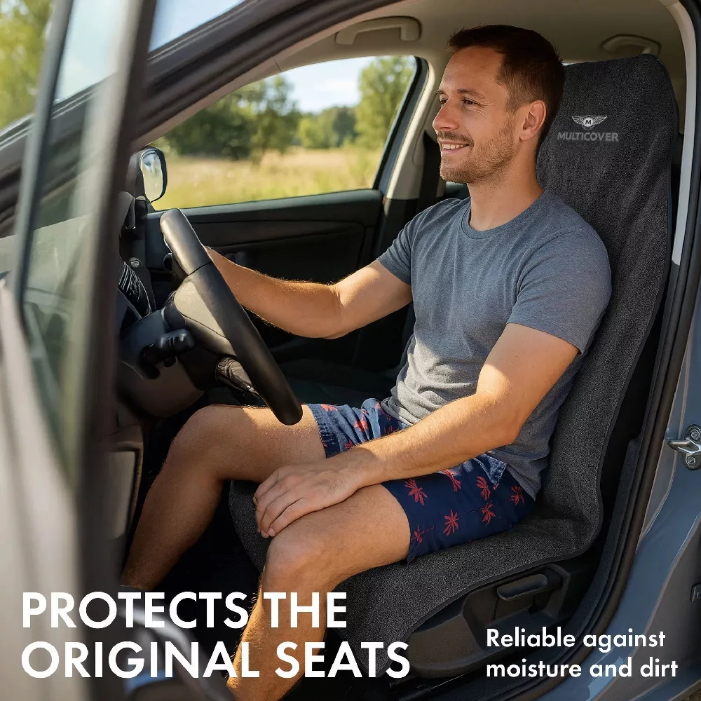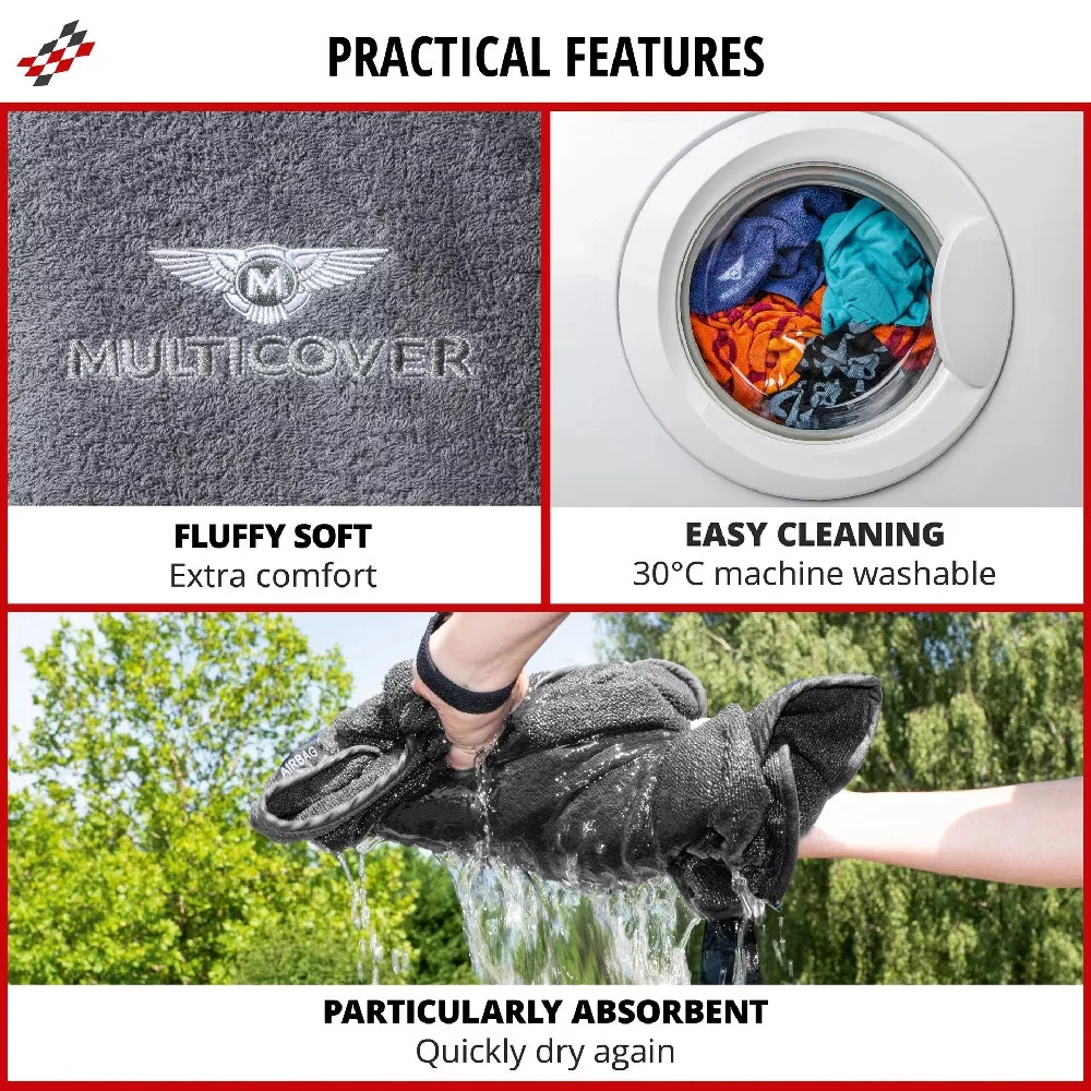 A Multicover kiváló minőségű 100% poliészterből készült, és 30 °C-on mosható. A pihe-puha anyag légáteresztő és különösen nedvszívó, ezért jól felszívja a vizet és szárazon tartja a környezetet. Ezenkívül a Multicover alkalmas integrált oldallégzsákokkal ellátott autóülésekhez.