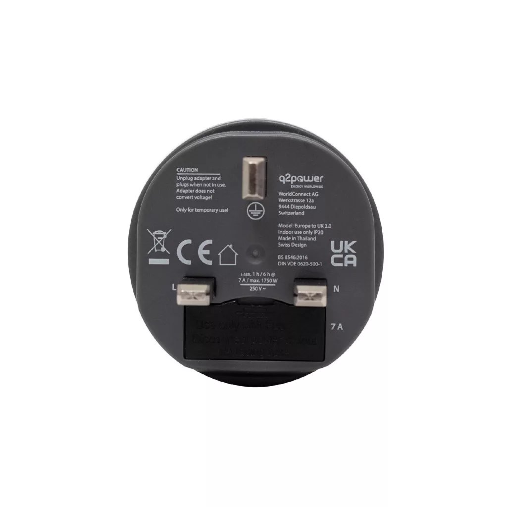 Ez az utazóadapter speciálisan tervezett azoknak, akik Európából az Egyesült Királyságba utaznak, és egy megbízható adapterre van szükségük. A \"Europe to UK"" funkcióval ellátott adapter lehetővé teszi a földelt GS csatlakozós készülékek használatát is. Az adapter kompatibilis az indulás országának GS szabványával, és a célország csatlakozójának UK szabványával. Bemeneti feszültsége 100-250 V, és akár 7 A maximális terhelést is képes kezelni. Teljesítménye 100 V esetén 700 W, míg 250 V esetén 1750 W.