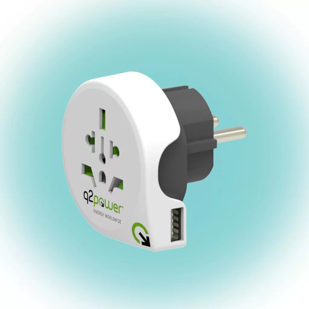 Q2POWER 1.100110 utazóadapter, World to Europe USB, bemeneti feszültség: 100-250 V, 16 A, teljesítmény: 100V-1600W/250V-4000W, USB port