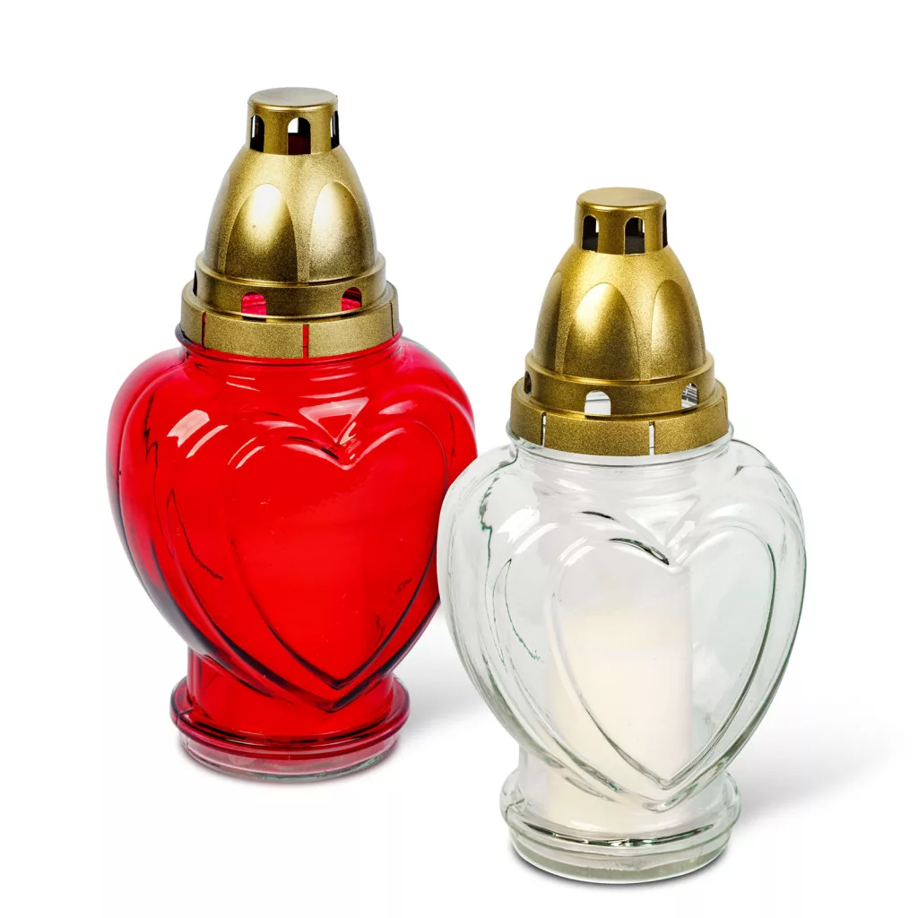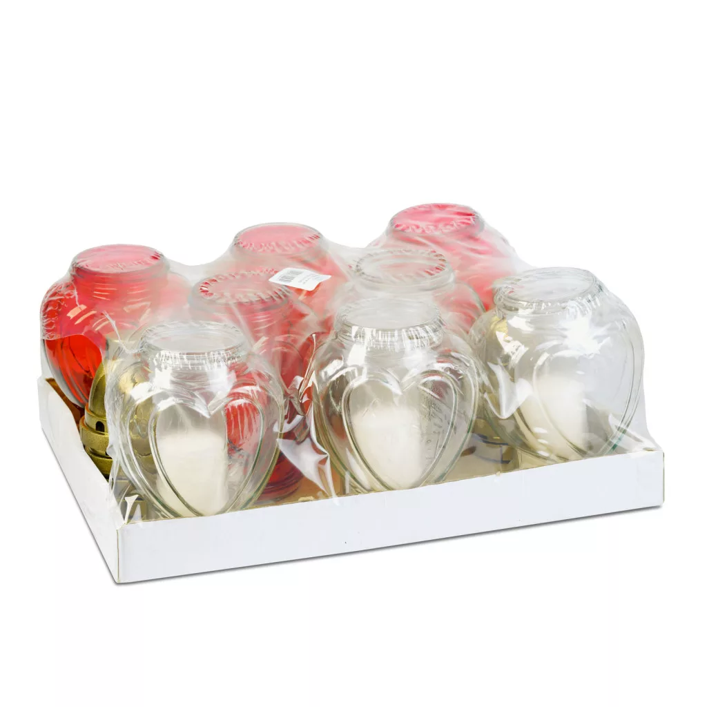 Üveg mécses - szív forma, műanyag kupakkal, piros - fehér - 21,7 cm