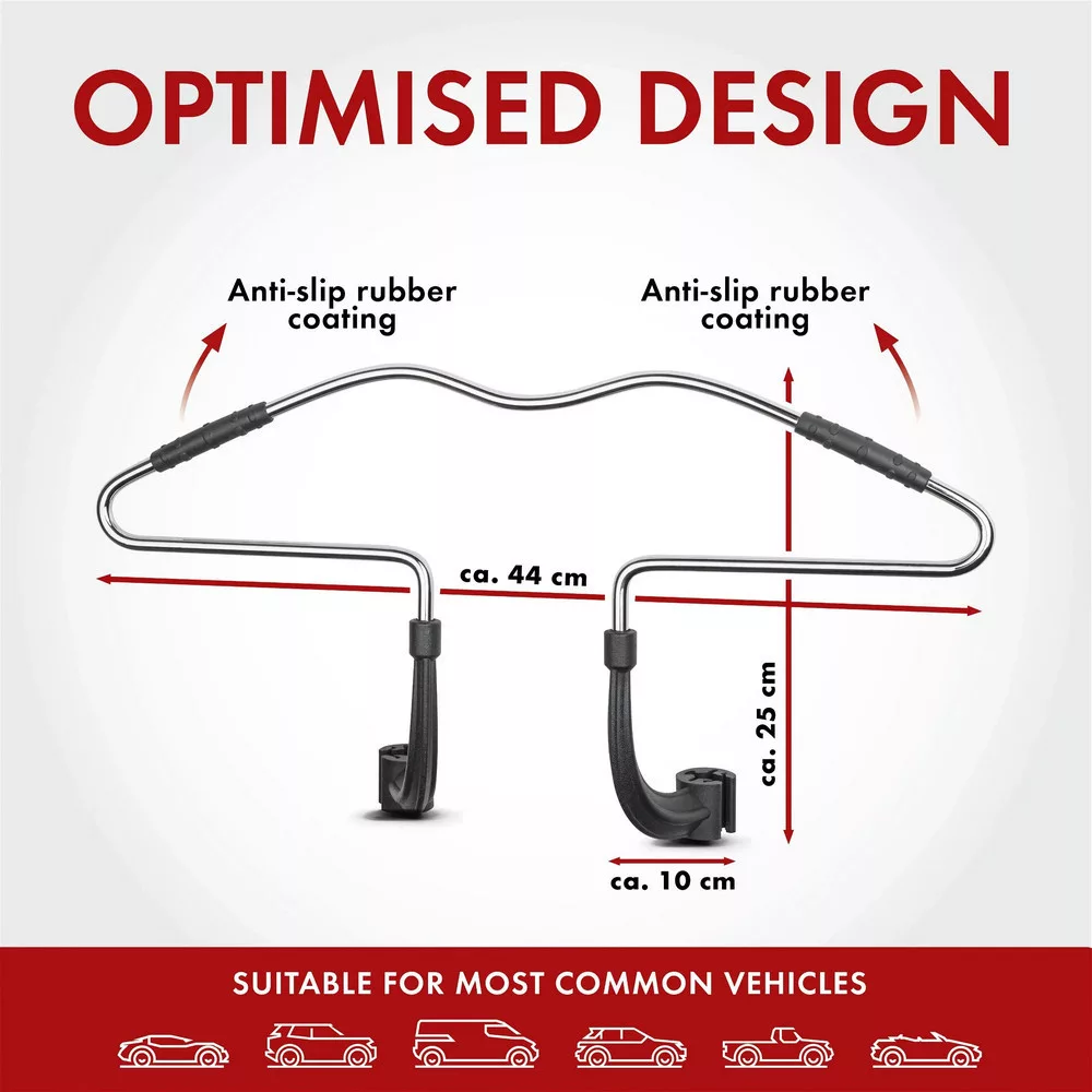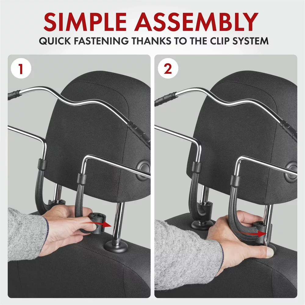 Minden olyan járműhöz ajánlott, ahol a fejtámla összeszereléshez eltávolítható. A ruhaakasztó néhány egyszerű lépésben rögzíthető, és ideális felakasztási lehetőséget biztosít ruhái számára. Az autós ruhaakasztó a fejtámlára van felszerelve, nem feltűnő megjelenéssel, amely beleolvad járművébe, és vezetés közben is észrevétlen marad. Tartós, minőségi autós ruhaakasztó A 44 cm szélességű autós ruhaakasztó sokféle ruhadarabhoz használható, férfiaknak és nőknek egyaránt ajánlott. A mindkét oldalon lévő csúszásmentes gumibevonatnak köszönhetően a ruha az utazás során szilárdan a vállfán marad, és gyűrődésmentesen érkezik. A praktikus utazási ruhaakasztó autójához erős fémből készült és ezüst színű. A rögzítőelemek fekete műanyagból készülnek, és szilárdan ülnek a fejtámlára, így biztosítva az optimális tartást a forgalomban.
