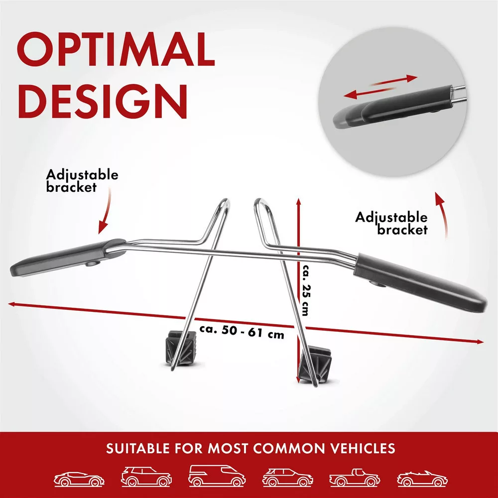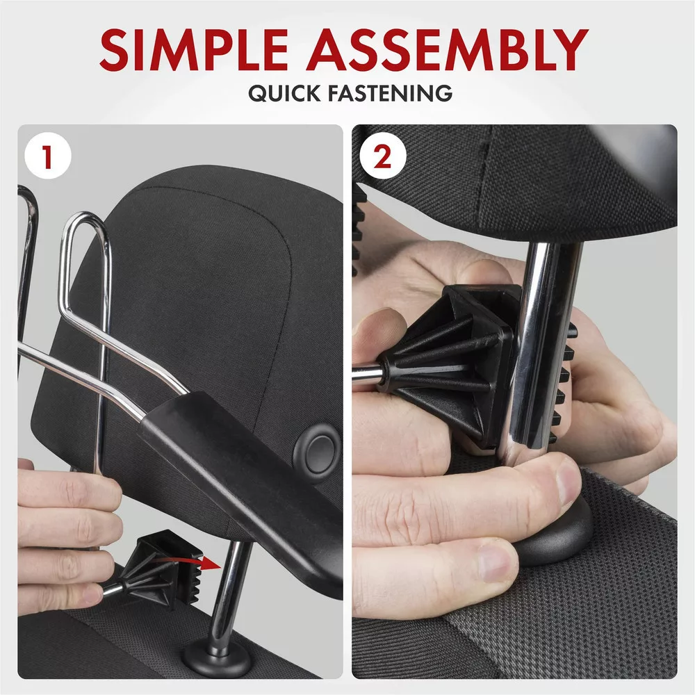 Minden olyan járműhöz ajánlott, ahol a fejtámla összeszereléshez eltávolítható. A ruhaakasztó néhány egyszerű lépésben rögzíthető, és ideális felakasztási lehetőséget biztosít ruhái számára. Az autós ruhaakasztó a fejtámlára van felszerelve, nem feltűnő megjelenéssel, amely beleolvad járművébe, és vezetés közben is észrevétlen marad. Tartós, minőségi autós ruhaakasztó. Sokféle ruhadarabhoz használható, férfiaknak és nőknek egyaránt ajánlott. A mindkét oldalon lévő csúszásmentes gumibevonatnak köszönhetően a ruha az utazás során szilárdan a vállfán marad, és gyűrődésmentesen érkezik. A praktikus utazási ruhaakasztó autójához erős fémből készült és ezüst színű. A rögzítőelemek fekete műanyagból készülnek, és szilárdan ülnek a fejtámlára, így biztosítva az optimális tartást a forgalomban.