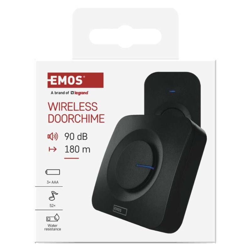a főegység tápellátása: 3× 1,5 V AAA (nem tartozék)|a gomb tápellátása: 1× 12 V A23 (tartozék)|alkalmazási nyelvek: –|a nyomógombok száma a csomagolásban: 1 db|a vevők száma a csomagolásban: 1 db|csengő méretek: 26 × 81 × 81 mm|dallamok száma: 52|egyéb funkciók: –|értékesítési csomagolás: 1 db, bliszter|értesítések a mobilalkalmazáshoz: nem|hangalapú asszisztensek általi vezérlés: nem|hangerőszabályzó: igen, 5 szint|hangkommunikáció: nem|hatótávolság: 180 m|jelátviteli frekvencia: 433 MHz|jelátviteli módszer: vezeték nélküli csengő|kompatibilitás: –|másik gomb hozzáadásának opciója: igen, max. 6|maximális csengetési hangerő: 90 dB|nyomógomb méretek: 19 × 42 × 72 mm|optikai jelzés a csengőn: igen|optikai jelzés a nyomógombon: igen|párosítási módszer: automatikus párosítás–self-learning|protokoll: –|sorozat: –|speciális funkciók: nem|szerelési anyag: –|szín: fekete|támogatott OS: –|tartalék (pót) nyomógomb: P5728T|vízálló gomb: IP56