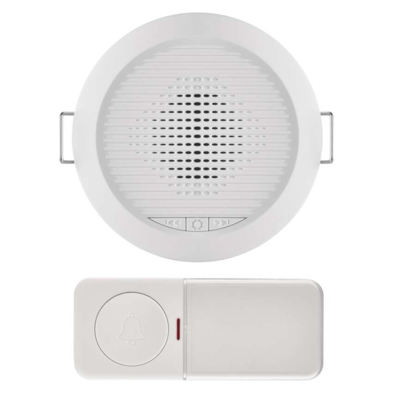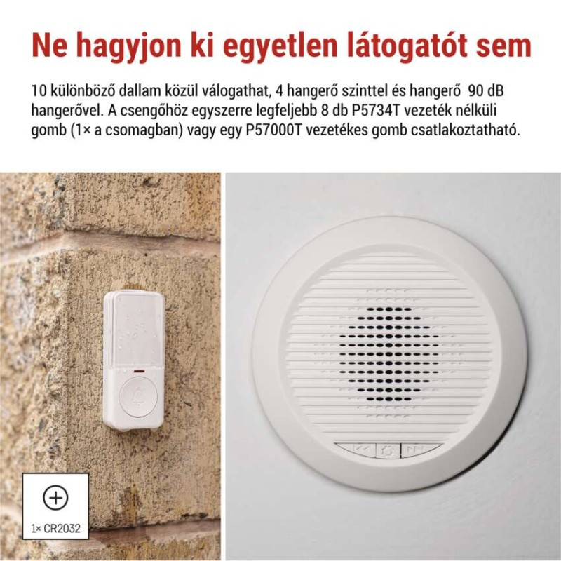 a főegység tápellátása: 230 V AC|a gomb tápellátása: 1× 3 V CR2032 (tartozék)|alkalmazási nyelvek: –|a nyomógombok száma a csomagolásban: 1 db|a vevők száma a csomagolásban: 1 db|csengő méretek: 90 × 50 mm|dallamok száma: 10|egyéb funkciók: –|értékesítési csomagolás: 1 db, kis doboz|értesítések a mobilalkalmazáshoz: nem|hangalapú asszisztensek általi vezérlés: nem|hangerőszabályzó: igen, 4 szint|hangkommunikáció: nem|hatótávolság: 180 m vagy vezetékes csatlakozás|jelátviteli frekvencia: 433 MHz|jelátviteli módszer: vezeték nélküli/vezetékes csengő|kompatibilitás: –|másik gomb hozzáadásának opciója: igen, max. 8|maximális csengetési hangerő: 90 dB|nyomógomb méretek: 19 × 38 × 92 mm|optikai jelzés a csengőn: nem|optikai jelzés a nyomógombon: igen|párosítási módszer: automatikus párosítás–self-learning|protokoll: –|sorozat: –|speciális funkciók: kétgombos csatlakozás|szerelési anyag: –|szín: fehér|támogatott OS: –|tartalék (pót) nyomógomb: P5734T; P57000T|vízálló gomb: IP54