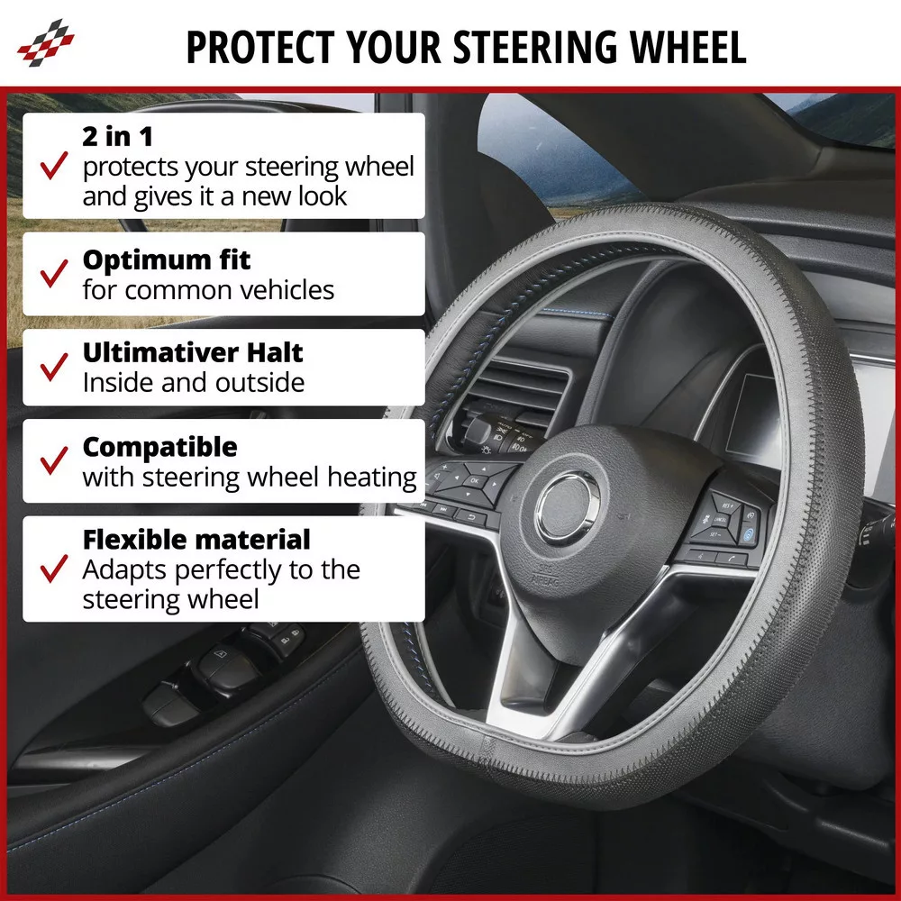 A Soft Grip kormánykerék-burkolat ideális termék a kormánykerék állandó erős fogásához, és autójának friss megjelenést kölcsönöz. Kiváló minőségű és mindenekelőtt rugalmas anyagból készült, amely tökéletesen illeszkedik a kormánykerékhez. A belső része csúszásgátló bevonattal rendelkezik, amely megakadályozza a csúszását. Kb. 38 cm átmérőjű kormánykerekekhez alkalmas, és integrált kormánykerék-fűtéshez is használható. A rugalmas anyag lehetővé teszi az egyszerű és gyors felszerelését kerek és lapos kormánykerekekre is. Helyezze a kormánykerék tetejére, majd feszítse lefelé a teljes kerékre. Úgy illeszkedik, mintha egy második bőr lenne.