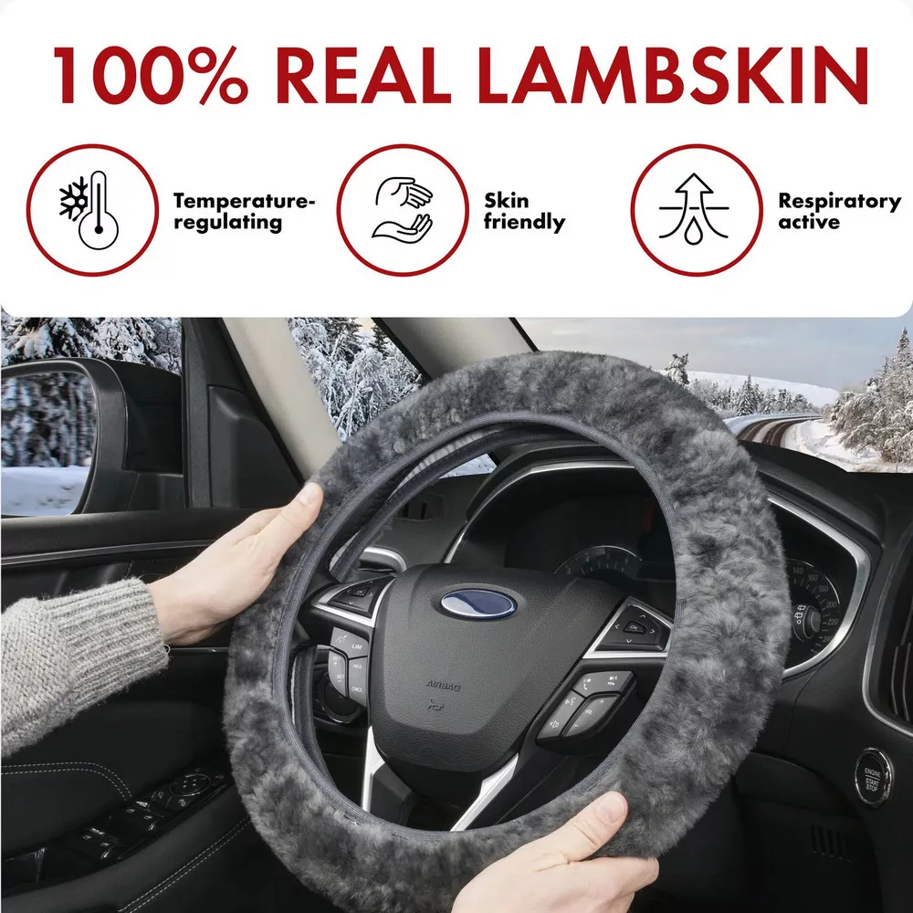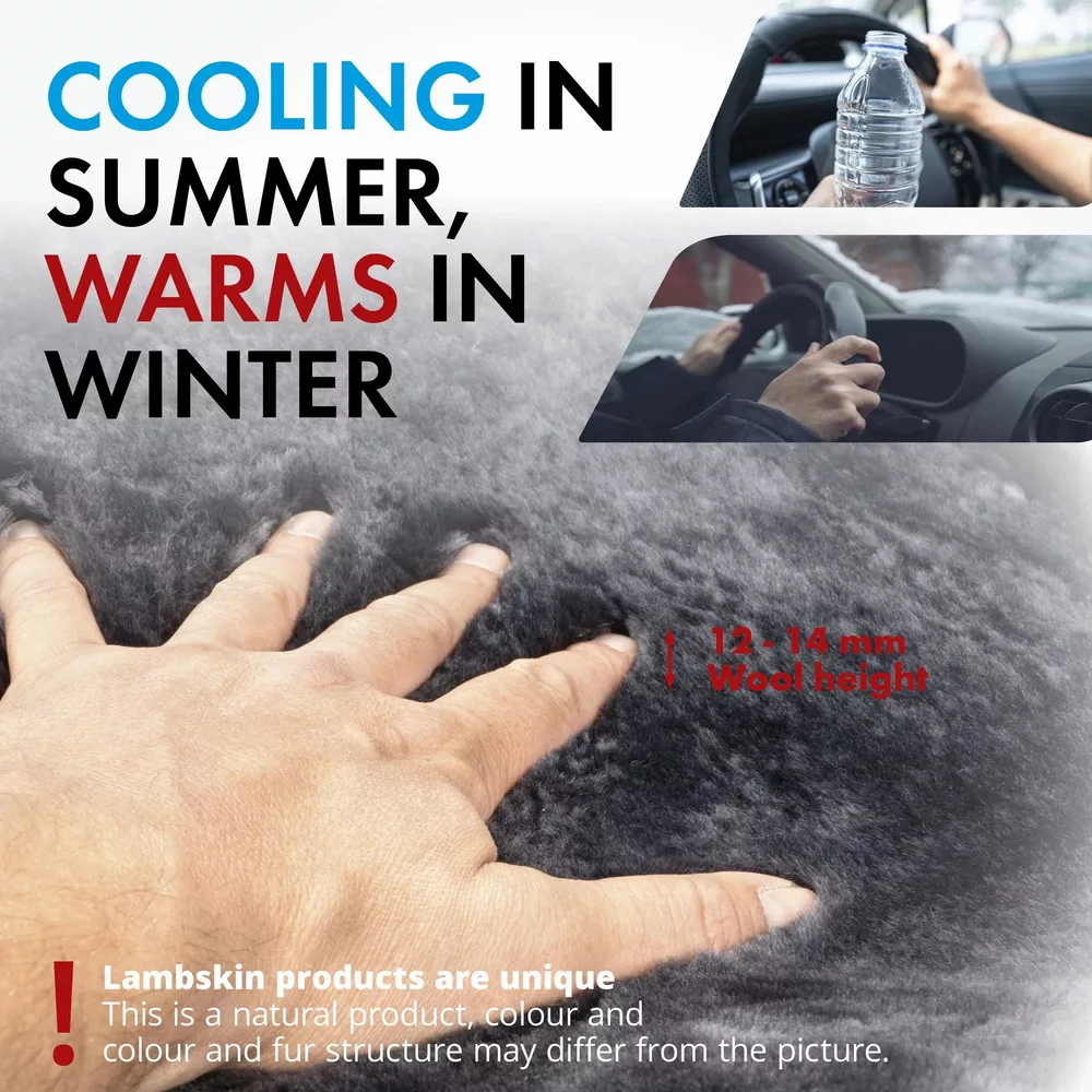 A báránybőr felmelegít a fagyos téli időben, és ideálisan kiegyenlíti a hőmérsékletet nyári időjárási körülmények között. Kiváló minőségű és vonzó: puha báránybőr gyapjú huzat. A kormánykerék burkolata 100%-ban valódi báránybőrből készült, kifinomult, első osztályú kidolgozással. Elasztikus szalagokkal van kialakítva, így a kormányburkolat szinten minden Ø37-39 cm méretű kormányra ráhúzható. A termék belseje jól laminált, így tökéletesen illeszkedik a kormányhoz.