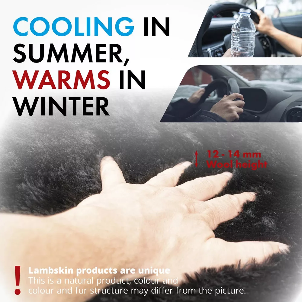 A báránybőr felmelegít a fagyos téli időben, és ideálisan kiegyenlíti a hőmérsékletet nyári időjárási körülmények között. Kiváló minőségű és vonzó: puha báránybőr gyapjú huzat. A kormánykerék burkolata 100%-ban valódi báránybőrből készült, kifinomult, első osztályú kidolgozással. Elasztikus szalagokkal van kialakítva, így a kormányburkolat szinten minden Ø37-39 cm méretű kormányra ráhúzható. A termék belseje jól laminált, így tökéletesen illeszkedik a kormányhoz.