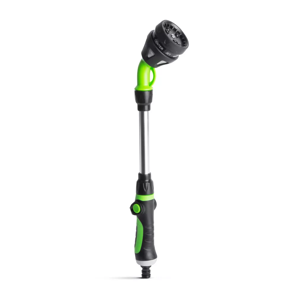 Locsoló pisztoly hosszú fém nyéllel, amely lehetővé teszi, hogy akár magasban vagy bokrok alá benyújtva célzottan juttassa el a vizet a növények számára. 8 db locsolási funkcióval rendelkezik, így garantáltan megtalálja az Önnek szükséges vízsugarat, legyen szó porlasztásról vagy vékony vízsugárról. A gyorscsatlakozó kuplung segítségével könnyen hordozható egyik öntözőtömlő végéről a másikra. A markolaton található szabályzó karnak köszönhetően fokozatmentesen állíthatja be, hogy mennyi vízre van szüksége.