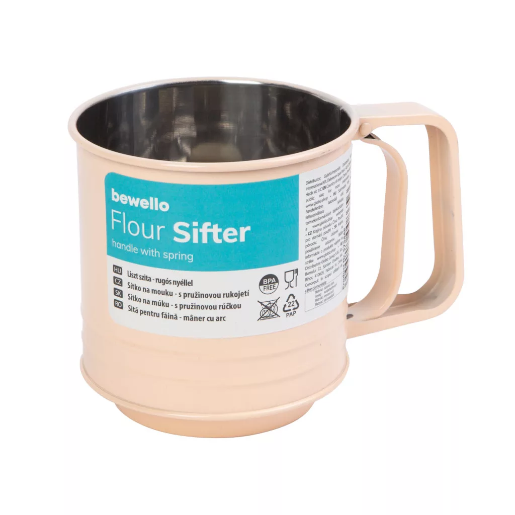 Ennek a praktikus liszt szitának a segítségével könnyedén és hatékonyan tudja átszitálni a lisztet, porcukrot vagy más porrá őrölt alapanyagokat a sütéshez és főzéshez. A szita kialakítása modern és funkcionális, lehetővé téve a pontos adagolást és a sima, csomómentes eredmények elérését. A szita alsó részén található finom szűrőrések gondoskodnak arról, hogy a liszt vagy bármely más száraz összetevő finomra szitálódjon, megszabadítva azokat a csomóktól és szennyeződésektől. A termék rozsdamentes acélból készült, ami tartósságot és higiénikus használatot garantál. A szita alsó pereme úgy van kialakítva, hogy akár üvegedénybe történő szitáláskor is kényelmesen használható legyen, így a szita mozgatása nélkül végezheti el a műveletet. A liszt szita ergonomikusan kialakított rugós nyele kényelmes fogást és könnyű használatot biztosít. A nyelet a szitálás során stabilan tudja tartani.