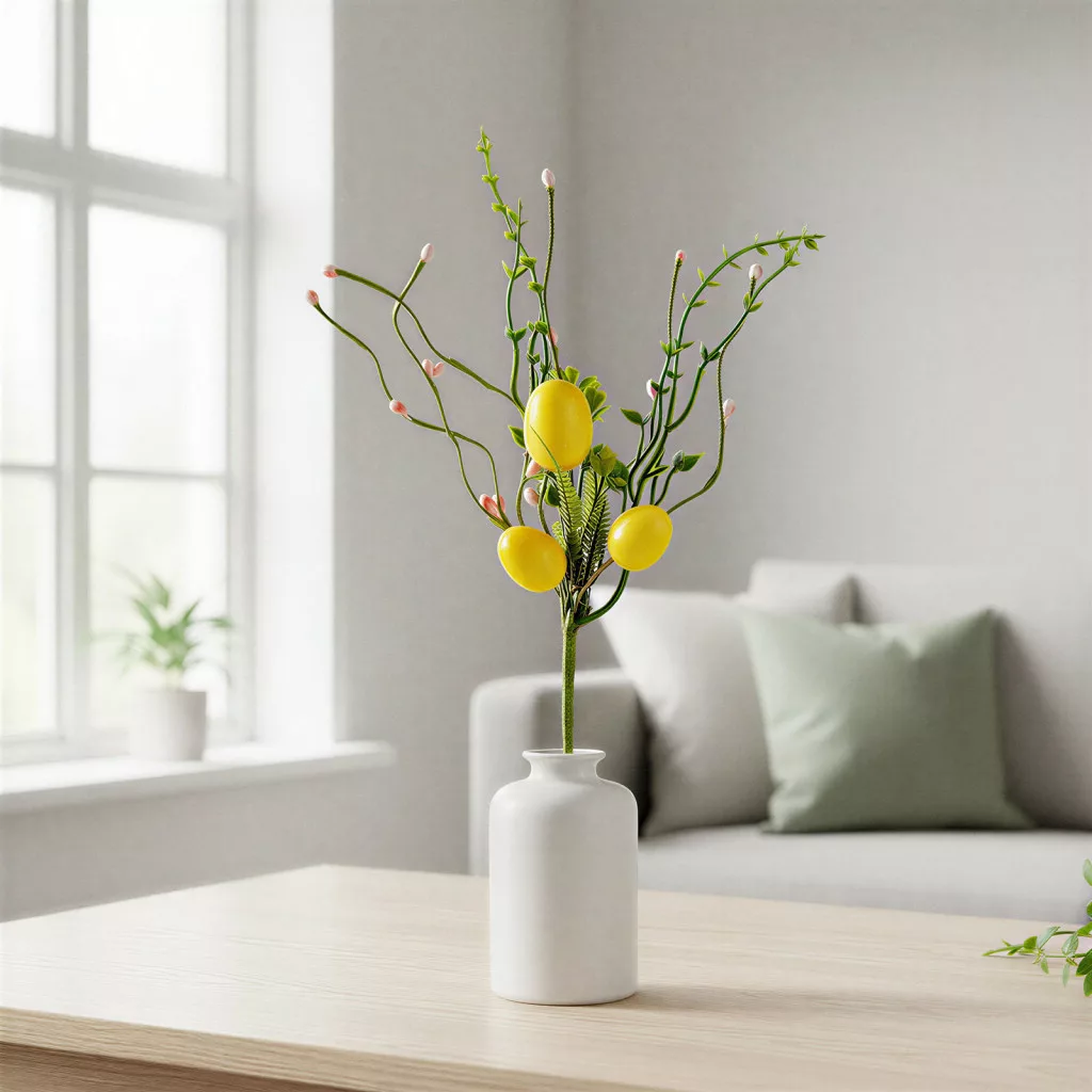 Ez a dekoratív húsvéti tojásfa ág tökéletes választás otthona tavaszi és húsvéti díszítéséhez. A rózsaszín tojásokkal és zöld levelekkel díszített ág vidám és ünnepi hangulatot teremt, amely remekül illeszkedik asztali kompozíciókhoz, koszorúkhoz, vázákhoz vagy akár ajándékcsomag dekorációjához is. Az élethű megjelenésű ág tartós anyagból készült, így évről-évre újra felhasználható. Részletgazdag kidolgozásának köszönhetően harmonikusan illeszkedik más tavaszi dekorációkhoz, feldobva bármely otthont vagy irodát.