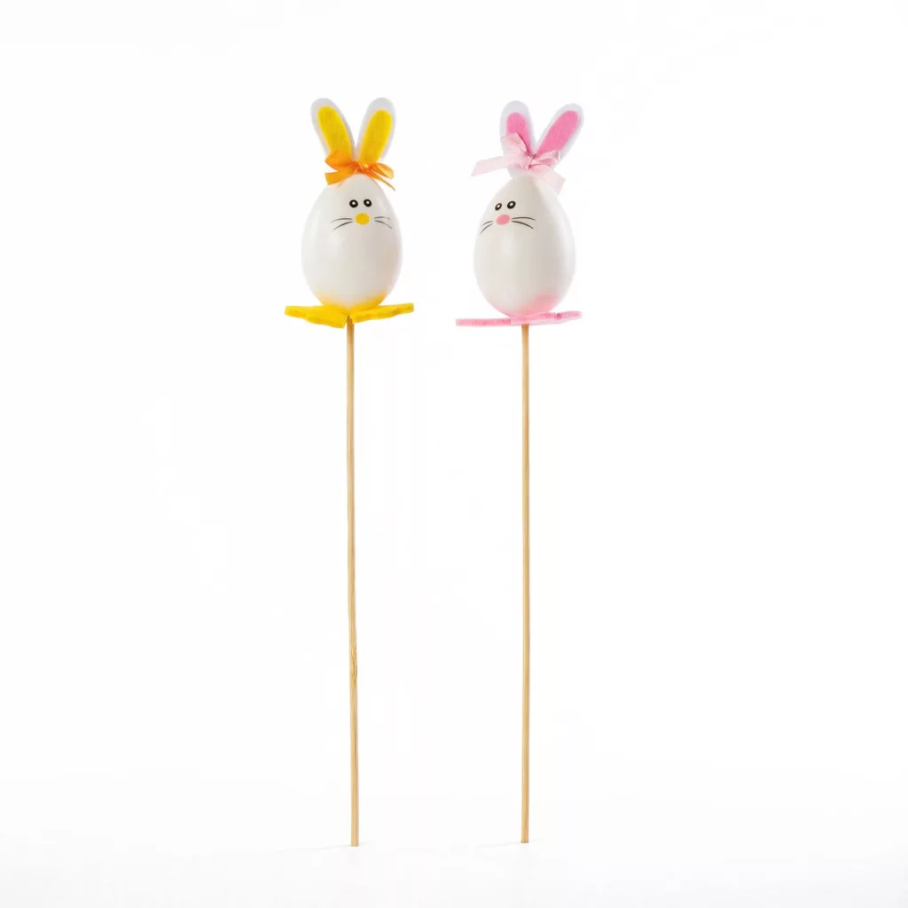 Tegye ünnepivé otthonát ezzel a bájos húsvéti dekorációval! A szett 2 darab, 33 cm hosszú pálcikás tojásfigurát tartalmaz, amelyek aranyos nyusziként vannak díszítve. A fehér tojás alakú testeket színes filcfülek (sárga és rózsaszín) és vidám masnik teszik különlegessé, így tökéletes kiegészítői lehetnek tavaszi kompozícióknak, virágcsokroknak vagy ünnepi asztaldíszeknek. A dekoráció könnyű, strapabíró anyagból (filc és műanyag) készült, praktikus leszúrható pálcikával, így egyszerűen elhelyezhető vázában, virágcserépben vagy bármilyen kreatív dekorációs összeállításban.
