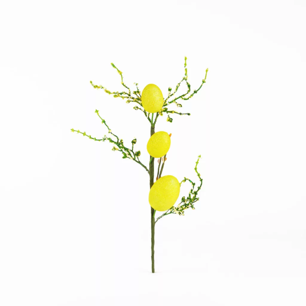 Dobja fel húsvéti dekorációját ezzel a csillogó tojásfa ággal! Az ág vidám, színes tojásokkal díszített, amelyek csillámos bevonatuknak köszönhetően különleges fényt adnak a kompozícióknak. Kétféle színben kapható, így könnyen kombinálható más ünnepi dekorációkkal. Ideális választás vázákba, kosarakba, asztali díszekbe vagy akár húsvéti tojásfákhoz.