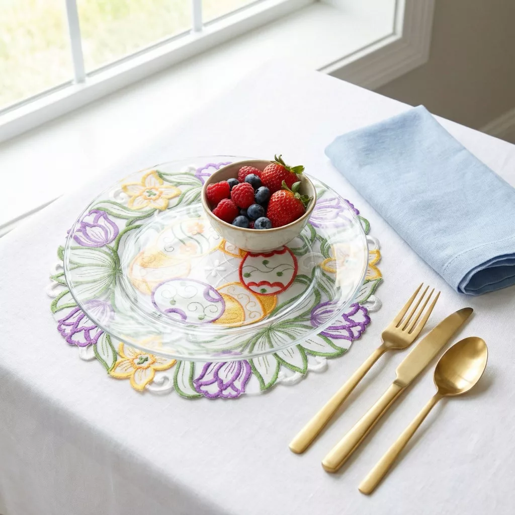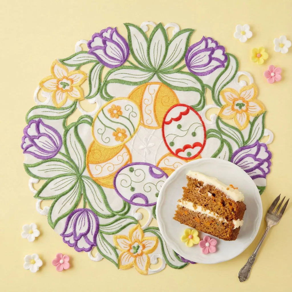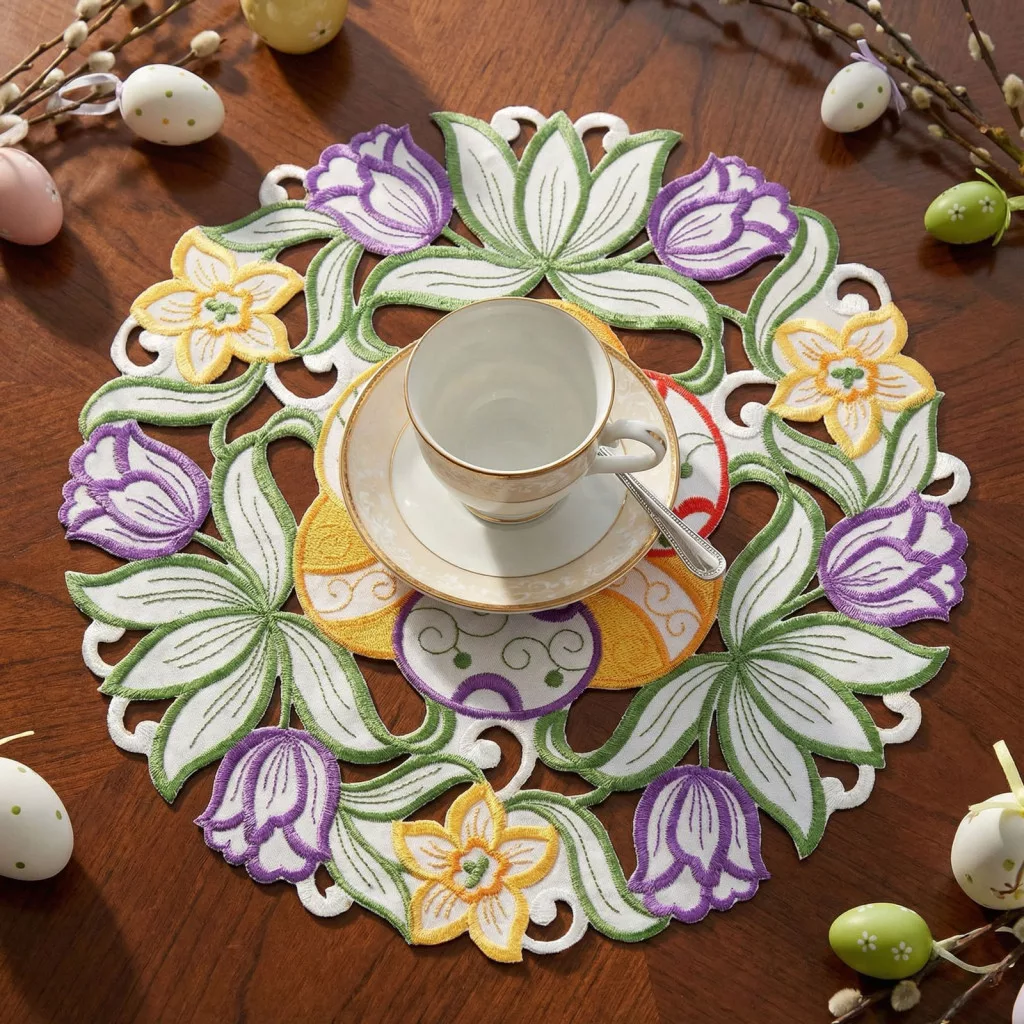 Ez a gyönyörű, hímzett húsvéti alátét különleges ünnepi hangulatot teremt asztalán. A közepén található színes tojásminták és a körben elhelyezett tavaszi virágmotívumok elegáns és vidám megjelenést biztosítanak. A részletgazdag hímzésnek köszönhetően az alátét nemcsak praktikus, hanem dekoratív elemként is tökéletes választás húsvéti terítékéhez.