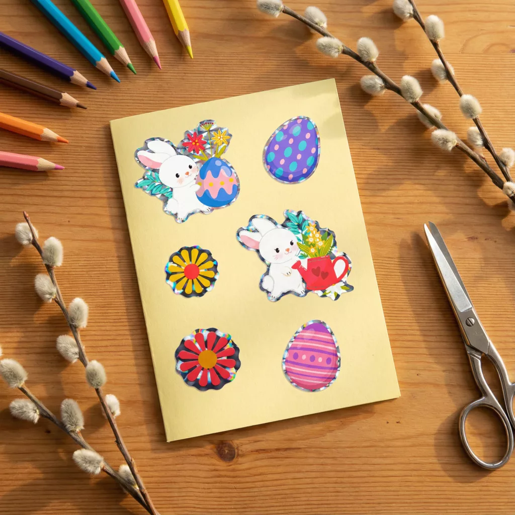 Dobja fel húsvéti dekorációját ezekkel a vidám, holografikus hatású matricákkal! Az íveken többféle mintát talál, köztük nyuszikat, tojásokat, csibéket és tavaszi virágokat. A matricák különleges csillogó felülete ünnepi hangulatot teremt, így ideálisak ajándékok díszítésére, kézműves projektekhez vagy gyerekek kreatív játékaihoz. A különféle stílusoknak köszönhetően mindenki megtalálhatja a hozzá legjobban illőt.
