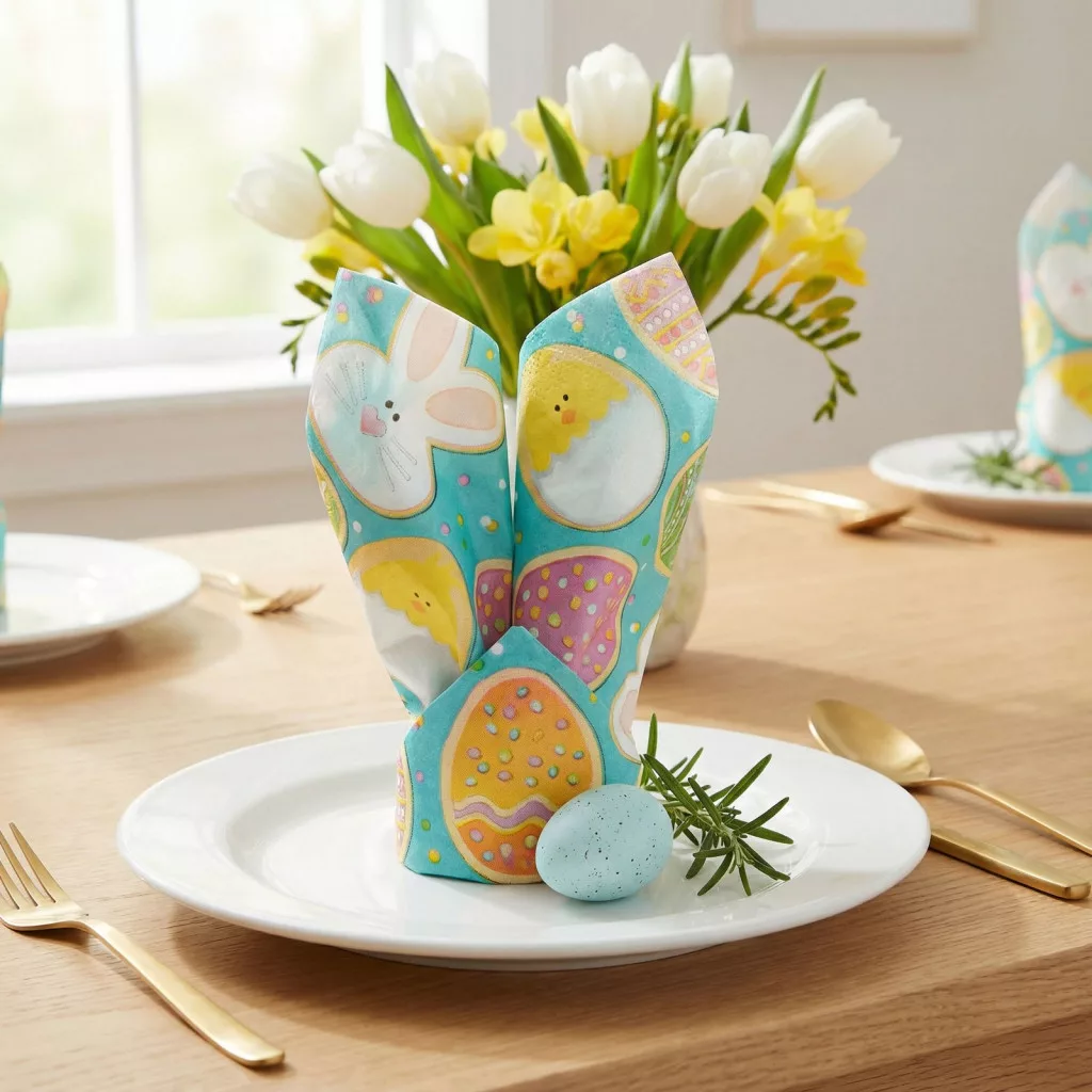 Dobja fel az ünnepi asztalát ezzel a vidám húsvéti szalvétával! A nyuszikat, csibéket és tojásmintákat ábrázoló, színes szalvéta tökéletes kiegészítője a húsvéti terítéknek. Anyaga biztosítja a kiváló nedvszívó képességet és a tartósságot, miközben a mintás design kellemes tavaszi hangulatot teremt. A csomag 16 darab szalvétát tartalmaz, amelyek praktikusak és dekoratívak egyaránt. Ideális választás húsvéti ebédekhez, családi összejövetelekhez vagy ünnepi vendégségekhez.