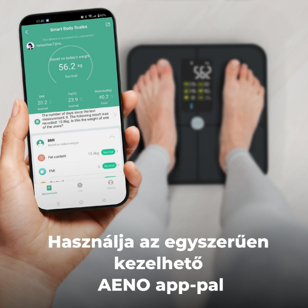 Az AENO SMART alkalmazás Bluetooth 5.0 szabványon keresztül csatlakozik a mérleghez, és egyértelműen jeleníti meg az adatokat. A rendszer 16 testösszetétel-értéket számít ki (pl. testzsír, izom és csonttömeg, víztartalom, protein arány, zsigeri zsírindex, BMR, metabolikus kor).
