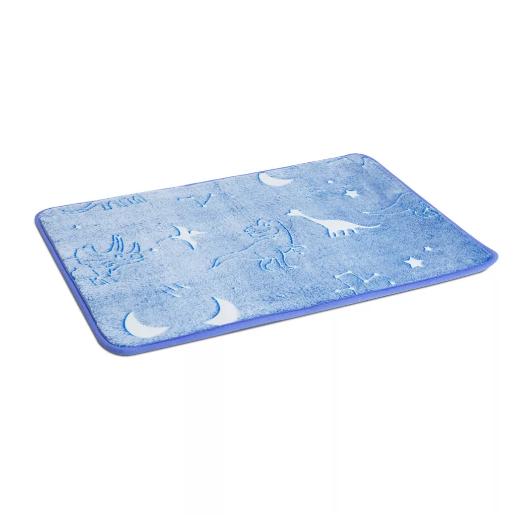Pamutból készült, éppen ezért extra puhasággal rendelkező szőnyeg. A gyermekek köztudott, hogy szeretnek a földön játszani, így ideális minden gyerekszobába, de alkalmas lehet fürdőszobák díszeként is. A szőnyeg foszforeszkáló pigmenteket tartalmaz, így természetes és mesterséges fény hatására is feltöltődik, sötétben pedig zöldes fénnyel ragyog. Az élénk kék szín és a dinoszauruszos minta vidám hangulatot varázsol bármely helyiségbe. A csúszásmentes, gumis hátoldalnak köszönhetően nem mozdul el, biztonságosan használható.