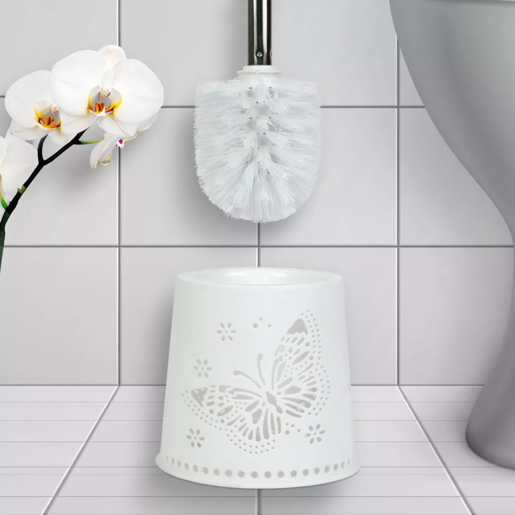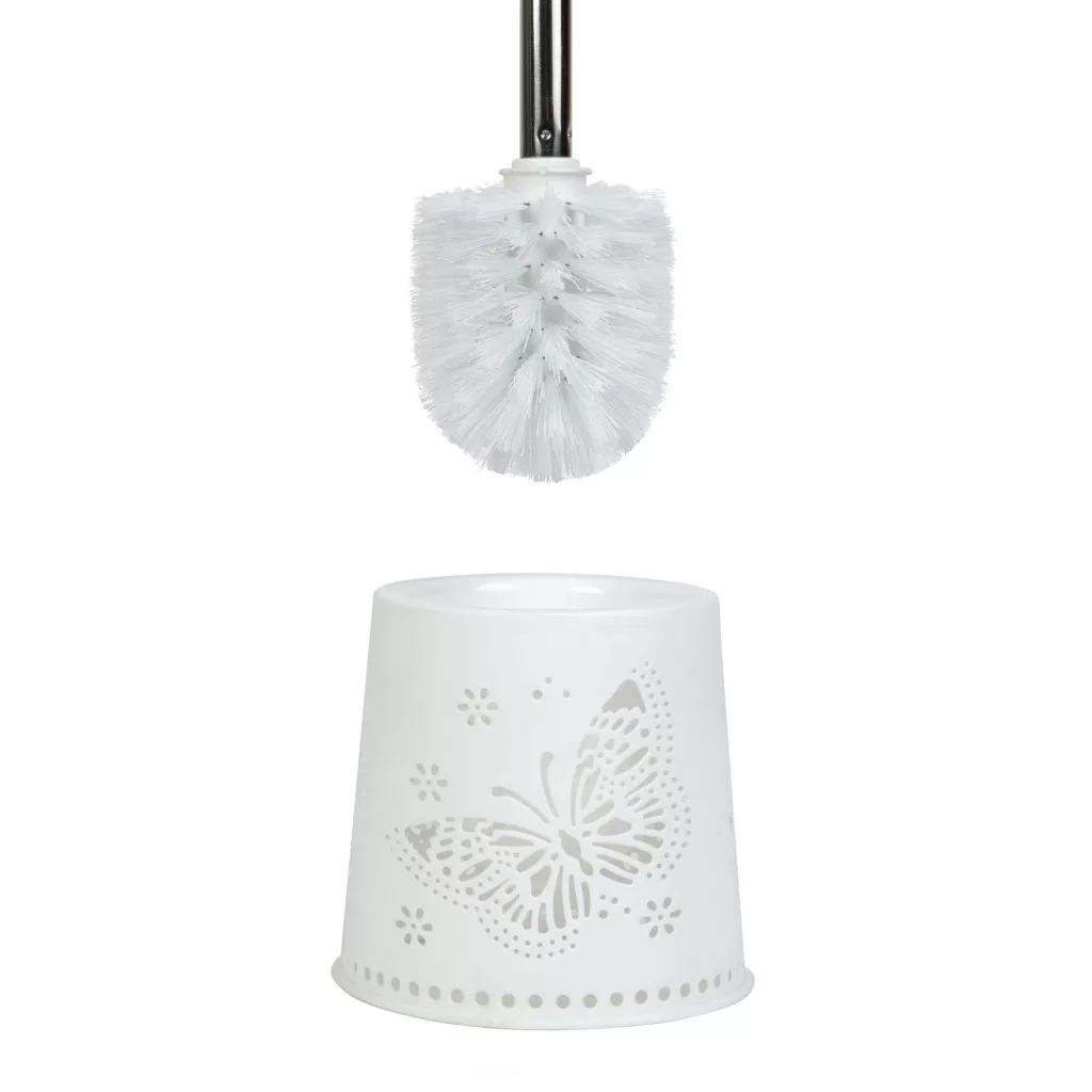 Praktikus WC-kefe + tartó szett matt fehér színben, pillangóval díszítve az oldalán. A tartó stabilitást és tartósságot nyújt a kefe számára. A kefe, fényes, ezüst színű nyéllel rendelkezik, amely könnyedén használható és kényelmes fogást biztosít. A WC-kefe hatékonyan segít a higiénia fenntartásában, míg a tartó gondoskodik a kefe biztonságos tárolásáról.