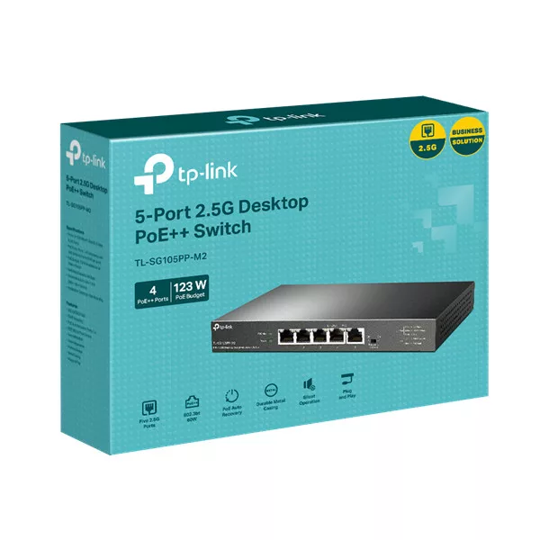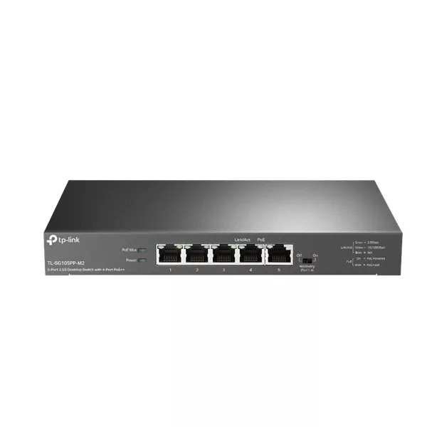 TP-LINK Switch 5x2.5G(4xPOE++) Fémházas Asztali, TL-SG105PP-M2