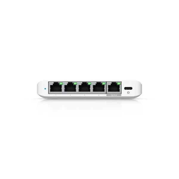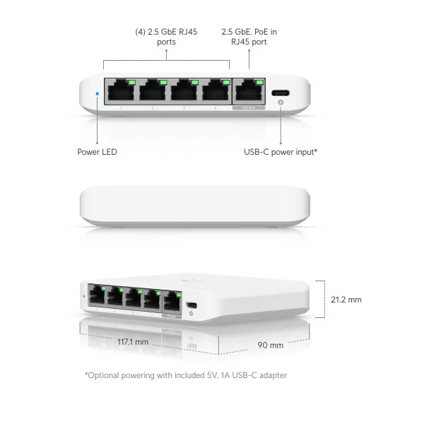 The Switch Flex Mini (USW Flex Mini) is a fully managed, Layer 2 switch with (5) GbE RJ45 ports, including (1) 802.3af PoE input. The USW Flex Mini can be powered with either PoE (via Port 1) or its included USB-C power adapter*. This switch can also be monitored or configured from anywhere with the powerful, intuitive UniFi Network web application and mobile app.