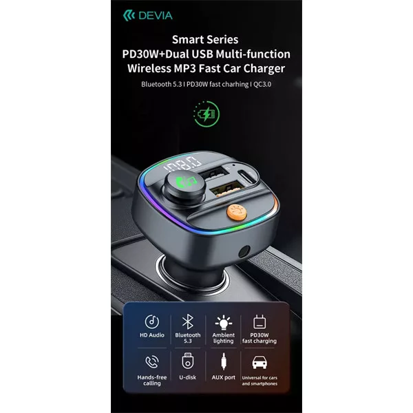 DEVIA Bluetooth FM-transmitter/autós gyorstöltő 30W PD+QC 2xUSB/AUX/MP3