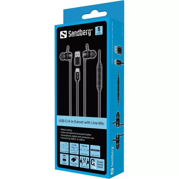SANDBERG Fülhallgató, USB-C/A In-Earset with Line-Mic