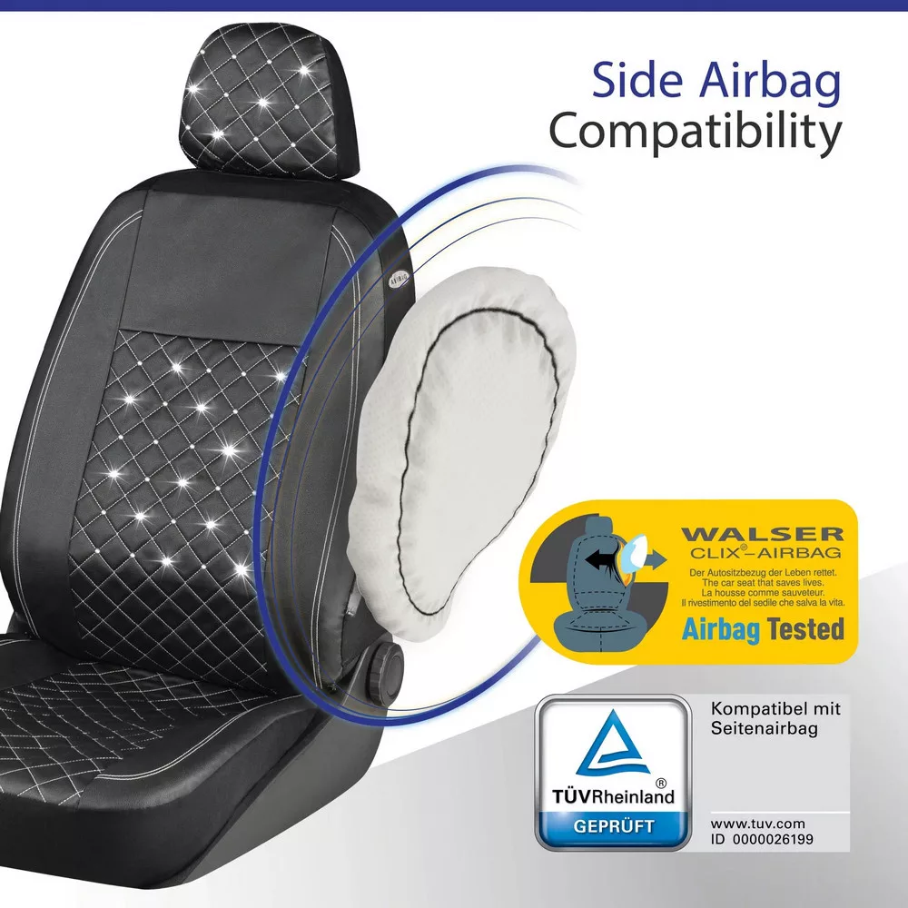 Az üléshuzatok nemcsak kiváló minőségű jersey anyagból készülnek, hanem a háttámlát is értékes Swarovski® kristályokkal díszítik. Ez teljesen új külsőt kölcsönöz autódnak, és az utasaidat is teljesen lenyűgözi a csillogó megjelenés. Ezenkívül az üléshuzat CLIX III rendszerrel van felszerelve, és integrált oldallégzsákkal rendelkező autósülésekhez is alkalmas. Így a termék vészhelyzet esetén megvédi Önt és utasait.