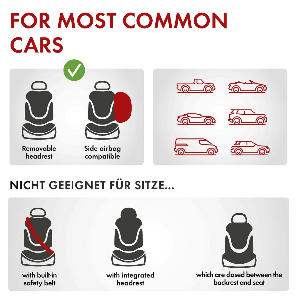 Az első ülés fejtámlájának levehetőnek kell lennie. Csak standard normál és sportülésekhez alkalmas (nem standard RECARO sportülésekhez). Az autósülések háttámlája és az ülőrész között nyílásnak kell lennie. Természetesen üléshuzataink ISOFIX-kompatibilisek, így a rendszert továbbra is használhatja a járművében, ha van ilyen.