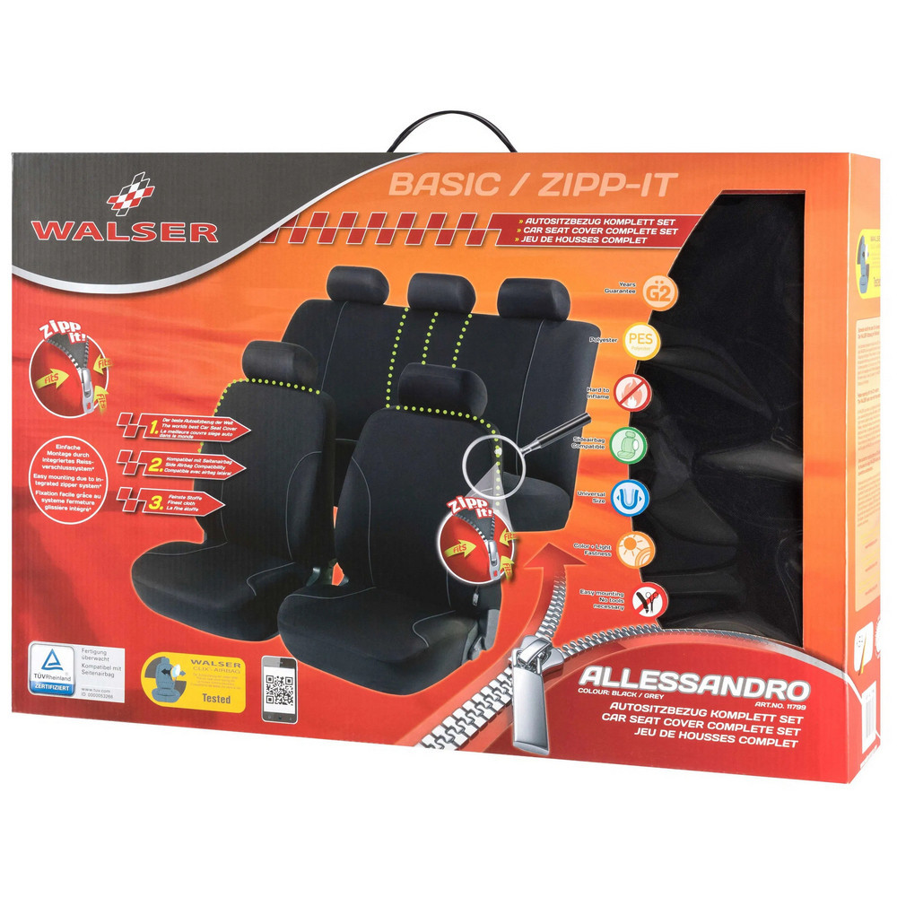 Az Allessandro fekete-szürke üléshuzatok tartós anyagból készülnek, és gyorsan és egyszerűen felszerelhetők. Először vedd le a fejtámlát, majd húzd az ülés- és háttámla részeket az autósülésre. Ezután rögzítsd mindkét részt egy kampóval az ülés alatt, és nyomd meg a fület középen a háttámla és az ülőrész között. Végül az integrált ZIPP-It rögzítőrendszernek köszönhetően a fejtámla könnyen visszahelyezhető és lefedhető a fejtámla huzattal.