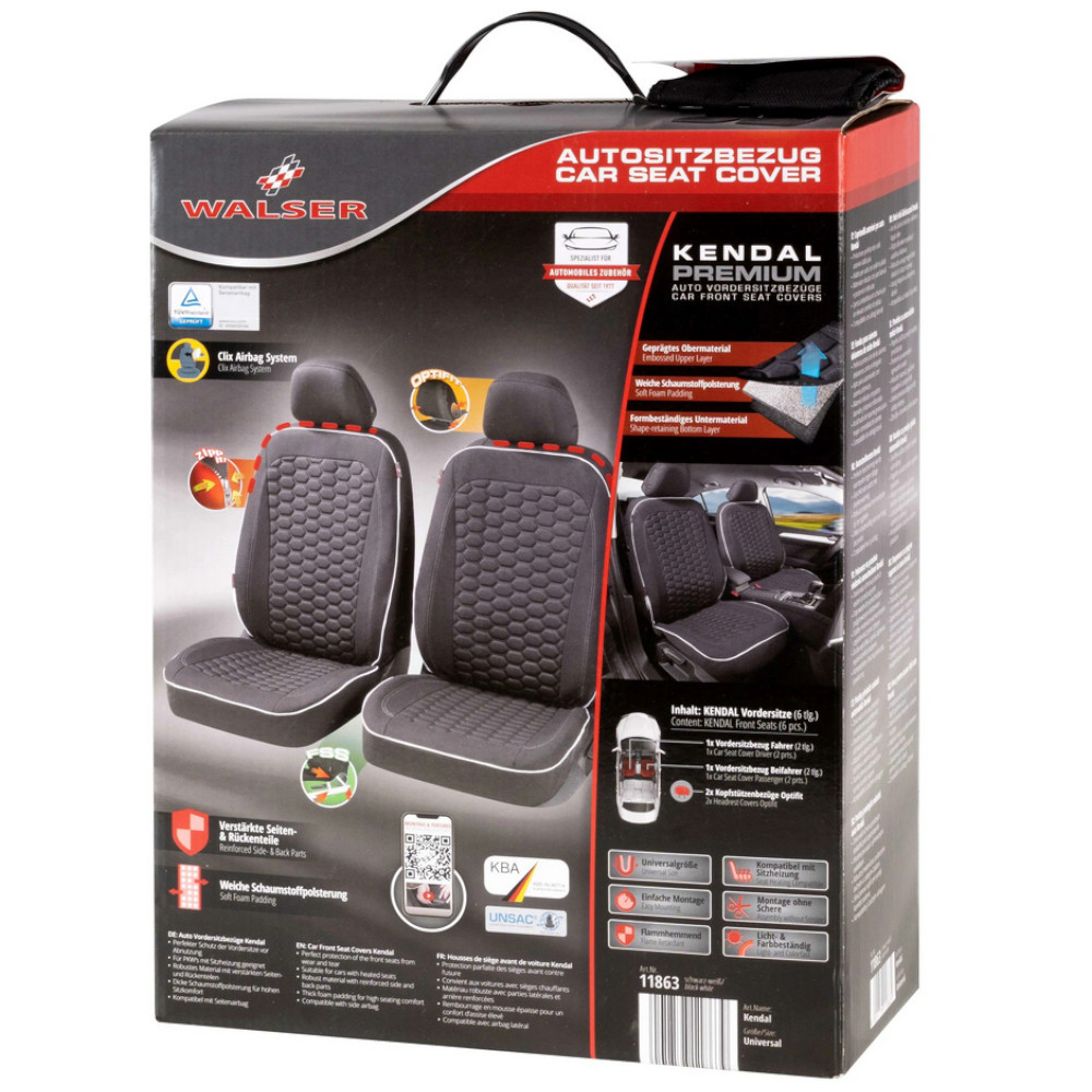 A Kendal üléshuzat valóban biztonságos, kiváló kidolgozással, modern dizájnnal rendelkezik, és könnyen felhelyezhető. Két első üléshuzat, valamint két szürke színű fejtámla-huzat olyan, mint a második bőr az autósüléshez. A régi ülések újszerűek lesznek, az új autó ülései pedig megbízhatóan védve lesznek a karcolásoktól. Klasszikus, modern és kényelmes: új megjelenés járművének Az üléshuzat évekig új külsőt kölcsönöz autójának, mivel fény- és színtartó. Az anyag 100% poliészterből készült, lángálló és 40 °C-on mosható. Az ülőfelület 3 mm-es hablaminált. A TÜV által tanúsított WALSER CLIX III légzsák-tépővarrat-rendszernek köszönhetően valóban biztonságos. A gondos és kíméletes tisztítás és ápolás érdekében kézi mosás javasolt, maximum 40 °C-on, meleg vízben, színes mosószerrel.