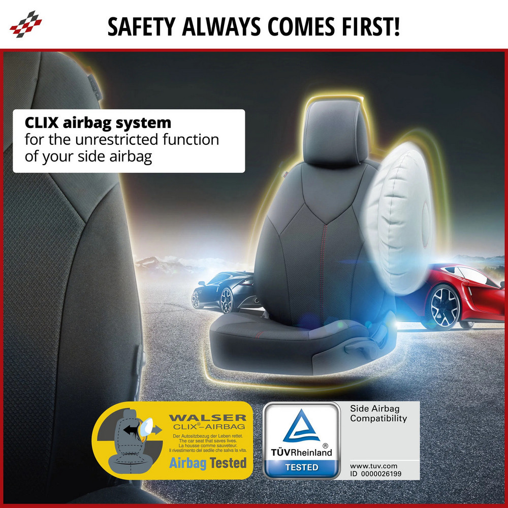 Az autós belső kiegészítők innovatív gyártójaként a WALSER kifejlesztett egy olyan üléshuzat- és üléspárna-rendszert, amely garantálja a biztonságot az autóban. A WALSER CLIX légzsákrendszer garantálja az oldallégzsákok helyes és akadálytalan kinyílását és szabad kinyílását. Ez biztosítja, hogy az üléshuzataink semmilyen körülmények között ne befolyásolják a légzsák életmentő funkcióját. Ezt a rendszert minden üléshuzat és üléspárna esetében a TÜV Rheinland Csoport teszteli úgy, hogy a légzsák biztonságos környezetben aktiválódik, és ha a teszt sikeres, jóváhagyási pecsétet ad ki. A WALSER világszerte a legtöbb elterjedt járművön végeztette el az autósülések tesztelését.