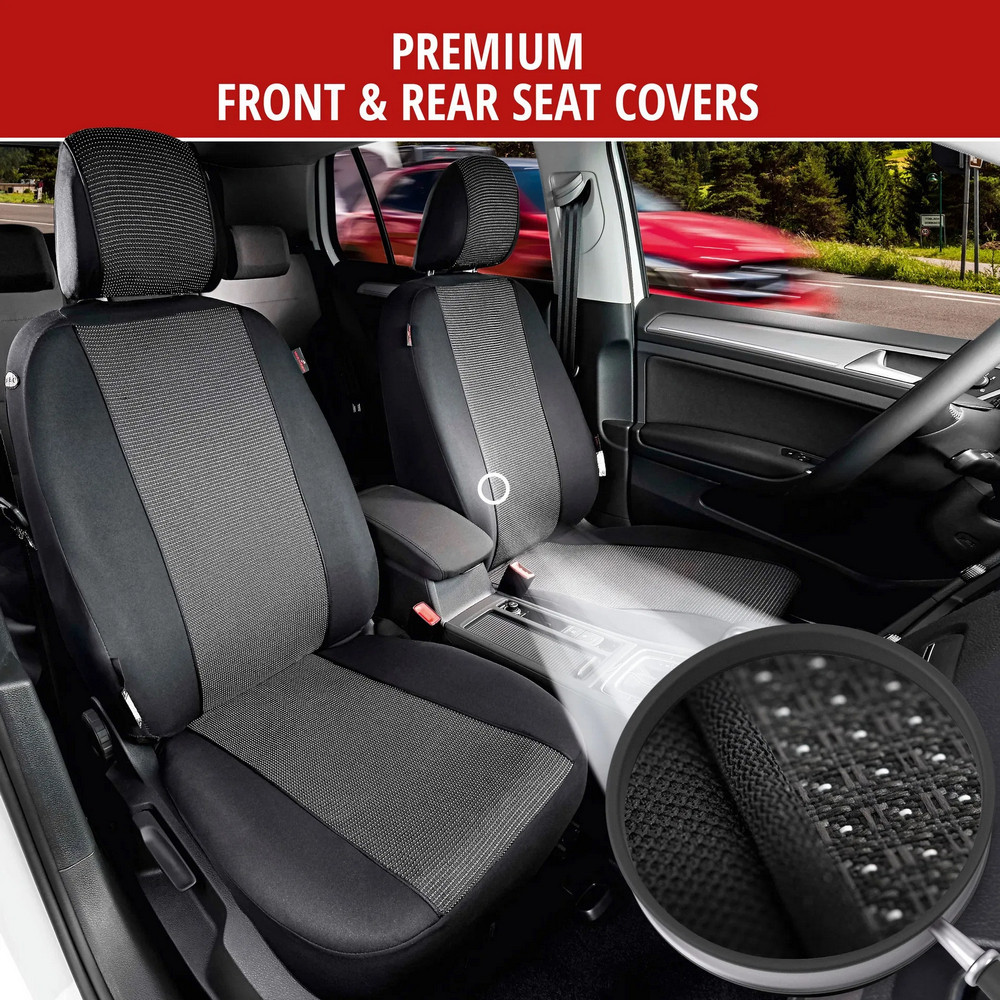 Az első üléshuzatok színtartó és kényelmes jacquard anyagból készülnek, amely 3 mm-es laminálással rendelkezik. Ezenkívül az első üléshuzatok CLIX III rendszerrel vannak felszerelve, minden beépített oldallégzsákkal rendelkező járműhöz alkalmasak. Így a termék maximális biztonságot nyújt Önnek és utasainak, és vészhelyzet esetén életeket menthet.
