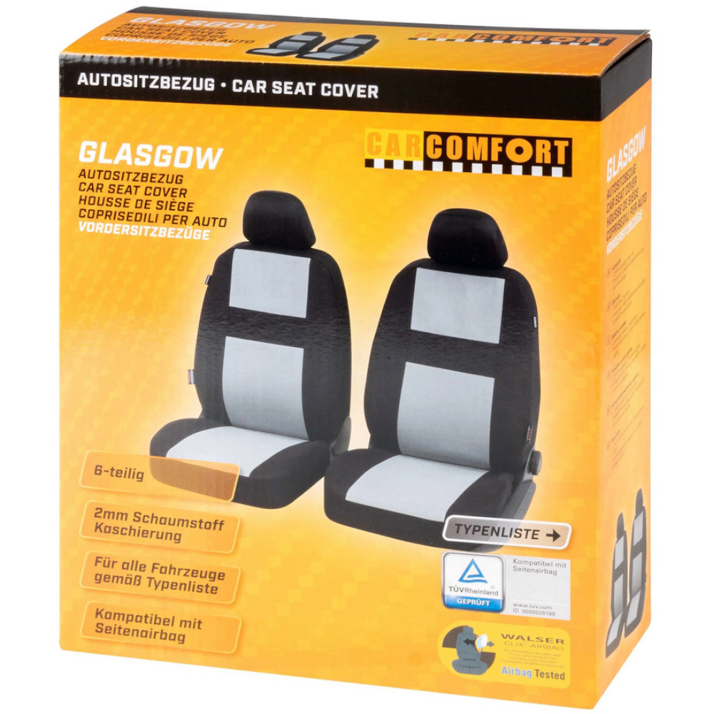 A Glasgow üléshuzatok tartós anyagból készülnek, és gyorsan és egyszerűen felszerelhetők. Először vegye le a fejtámlát, majd húzza az ülés és a háttámla részeit az autóülésre. Ezután rögzítse mindkét részt egy kampóval az ülés alatt, és nyomja a fület középen a háttámla és az ülőrész közé. Végül az integrált ZIPP-It rögzítőrendszernek köszönhetően a fejtámla könnyen visszahelyezhető és letakarható a fejtámla huzattal.