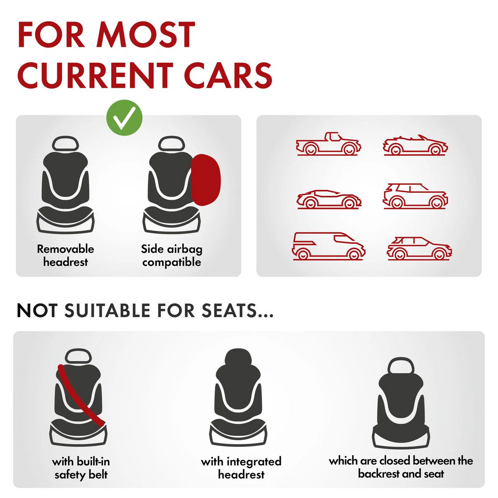 Az első ülés fejtámlájának levehetőnek kell lennie. Csak standard normál és sportülésekhez alkalmas (nem standard RECARO sportülésekhez). Az autósülések háttámlája és az ülőrész között nyílásnak kell lennie. Természetesen üléshuzataink ISOFIX-kompatibilisek, így a rendszert továbbra is használhatja a járművében, ha van ilyen.