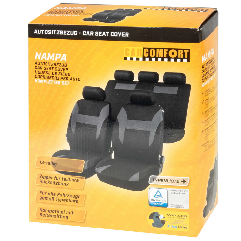 A Nampa kiváló minőségű üléshuzat, igazi „wow” faktort kölcsönöz járművének belseje számára. A huzatok felhelyezése is egyszerű. A fejtámlák eltávolítása után egyszerűen átcsúsztathatja a huzatokat az üléseken, és horgokkal rögzítheti azokat az ülés alatt. Vágjon két nyílást a megjelölt területeken a fejtámlához való illeszkedés érdekében. A kiváló minőségű anyag strapabíró és könnyen tisztítható.