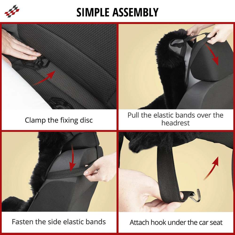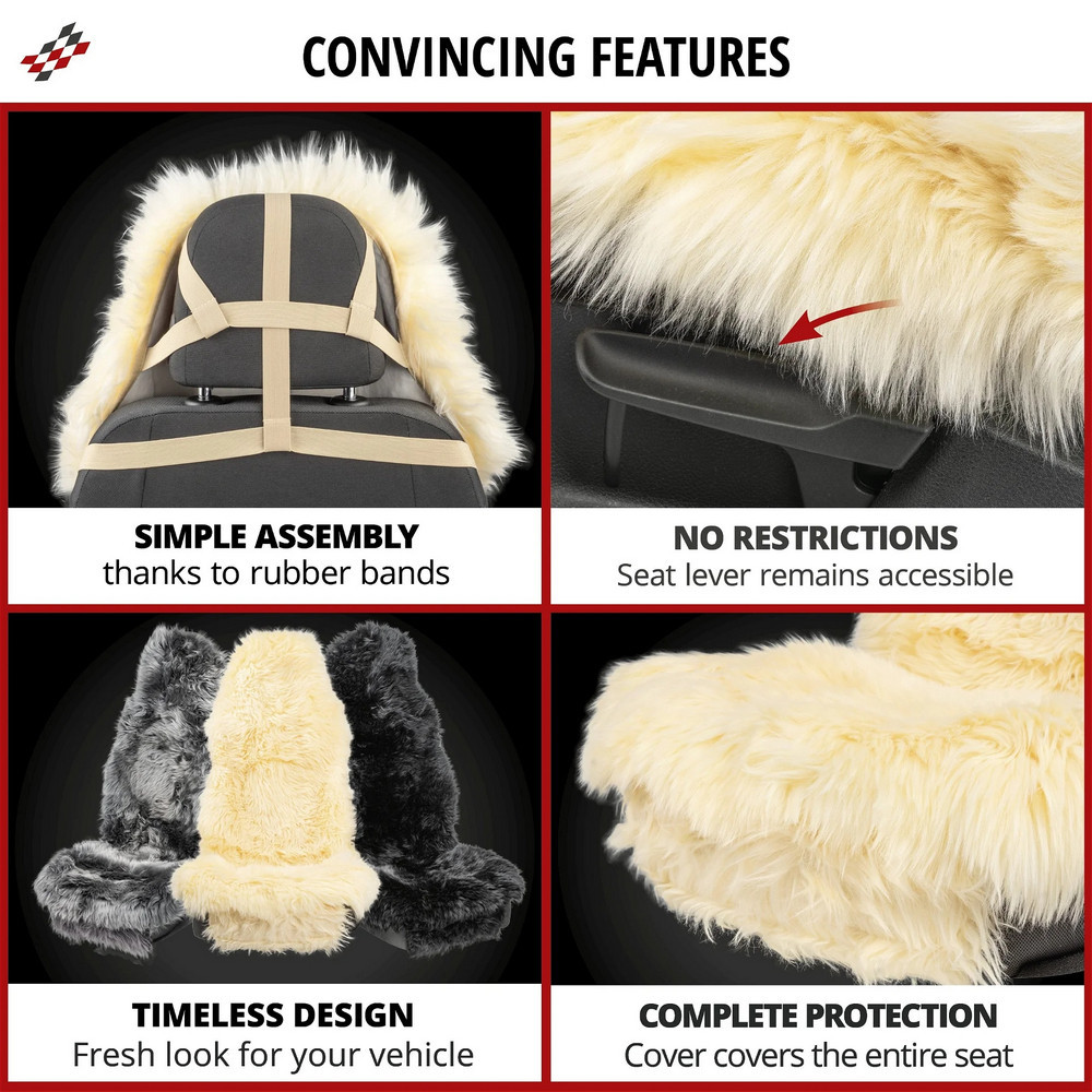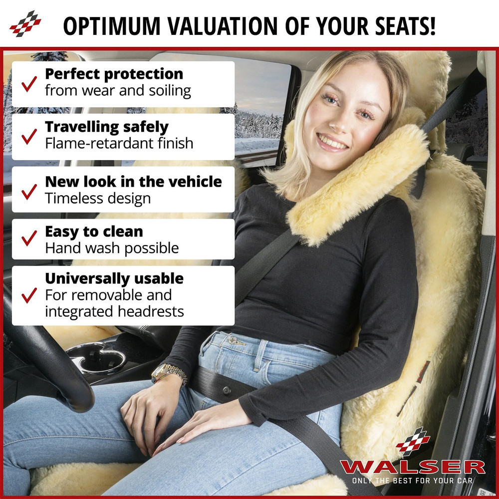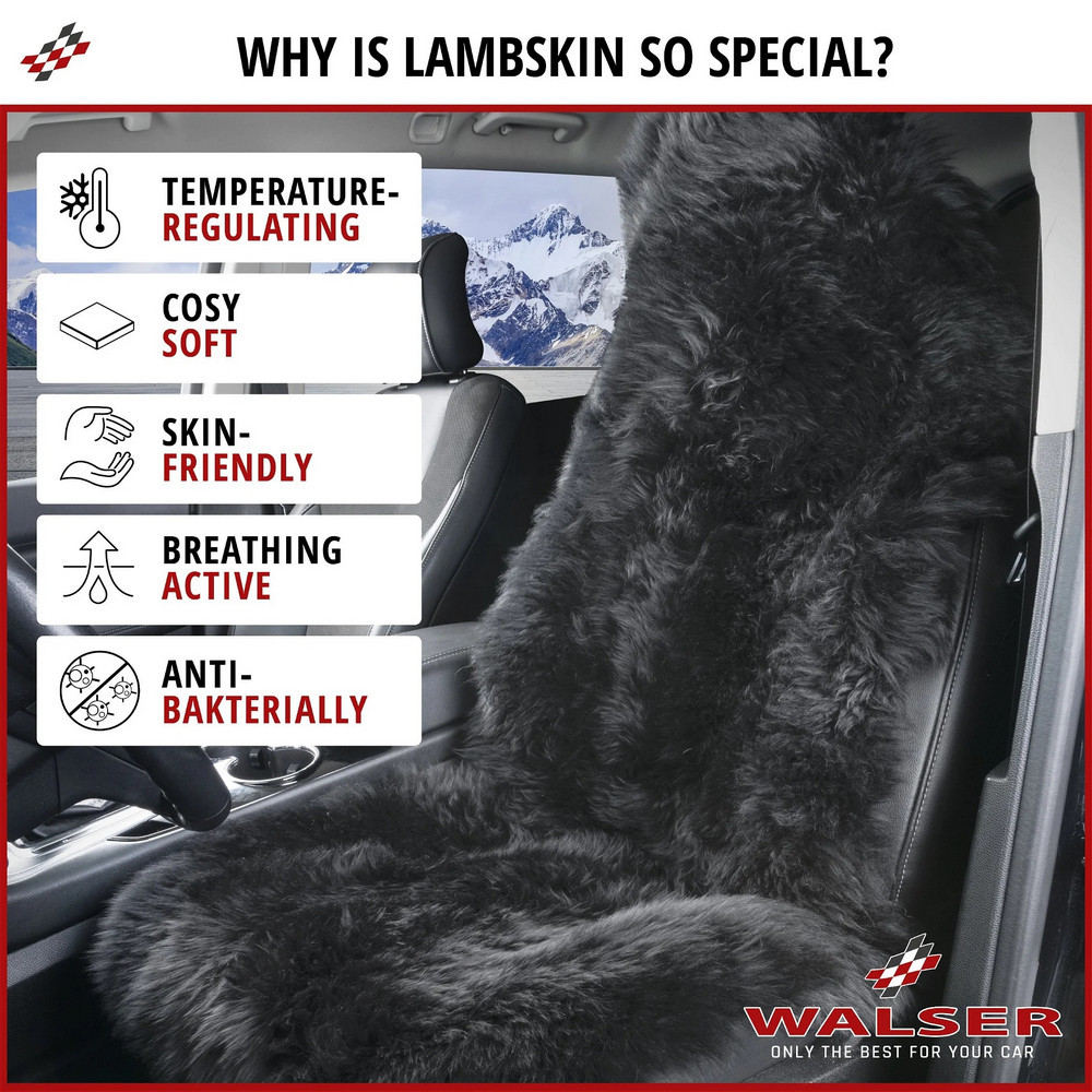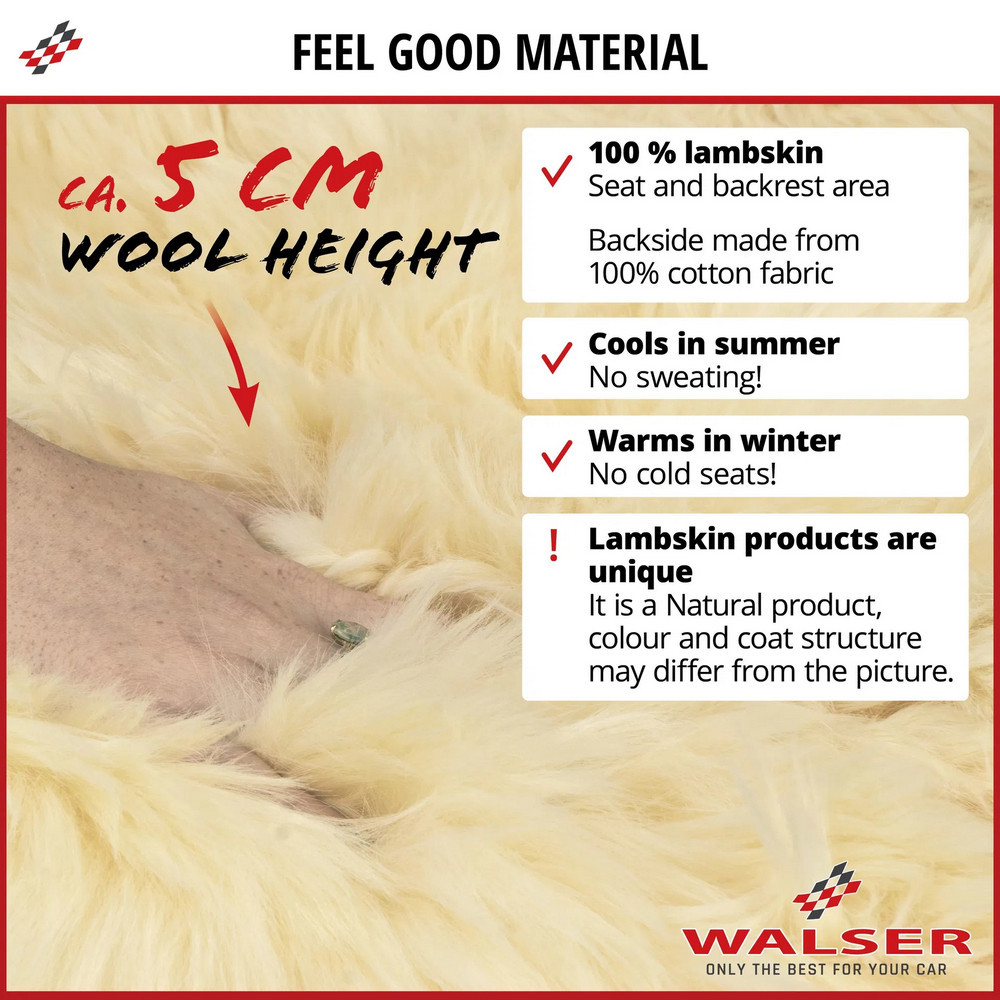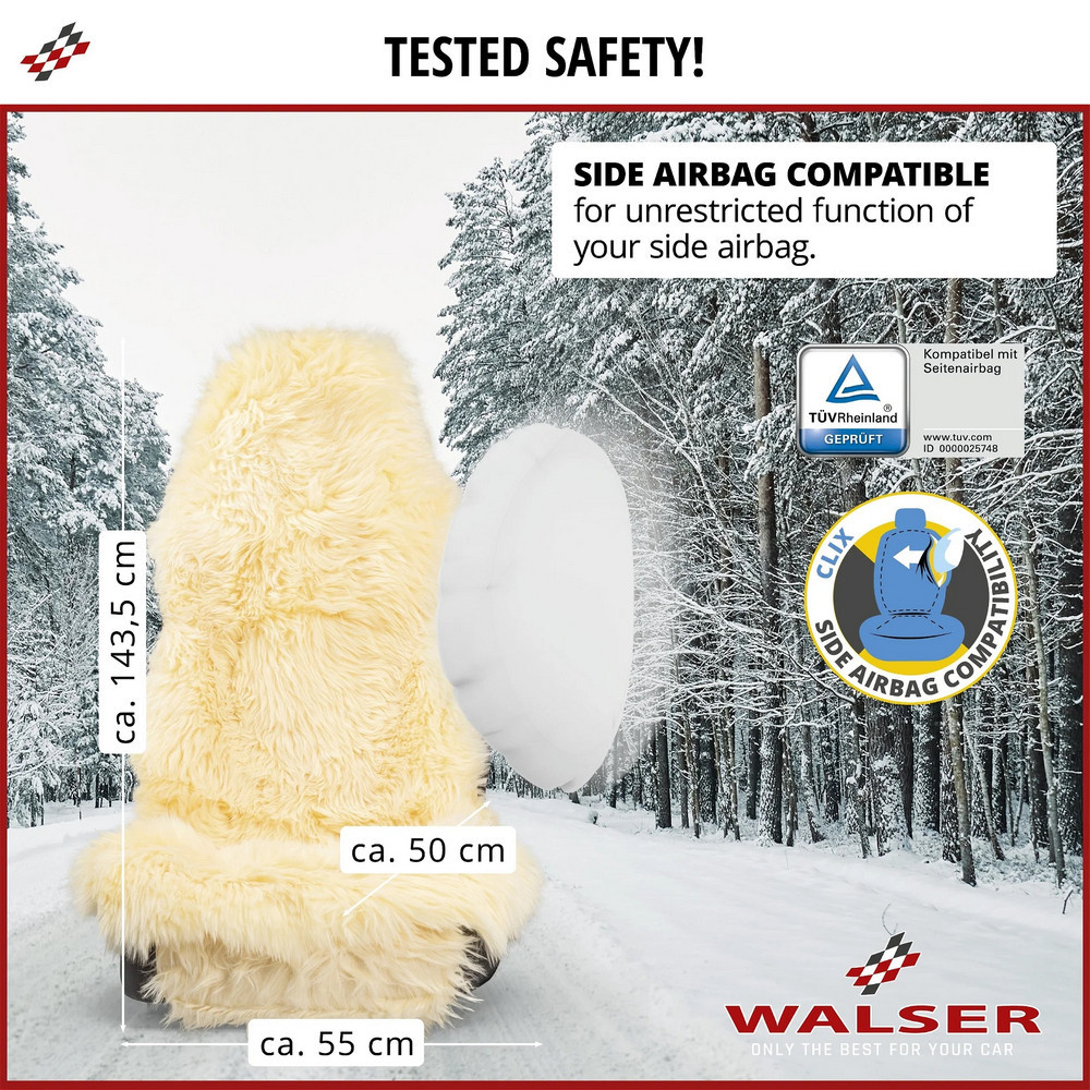 Az ülés- és háttámlafelületek 100%-ban báránybőrből készültek, és antibakteriális tulajdonságokkal rendelkeznek. Kb. 50 mm-es gyapjúmagasságukkal nemcsak kiemelkedő ülési kényelmet, hanem kellemesen puha ülésérzetet is biztosítanak minden utazás során. Ezenkívül a báránybőr egy természetes anyag, hőmérséklet-szabályozó és lélegző tulajdonságokkal, amelyet bőrbarát jelleg jellemez. Az üléshuzat oldallégzsákokkal kompatibilis, nem befolyásolja a légzsák biztonságos működését. Ez azt jelenti, hogy az oldallégzsák vészhelyzetben akadálytalanul kinyílhat, garantálva az Ön biztonságát.
