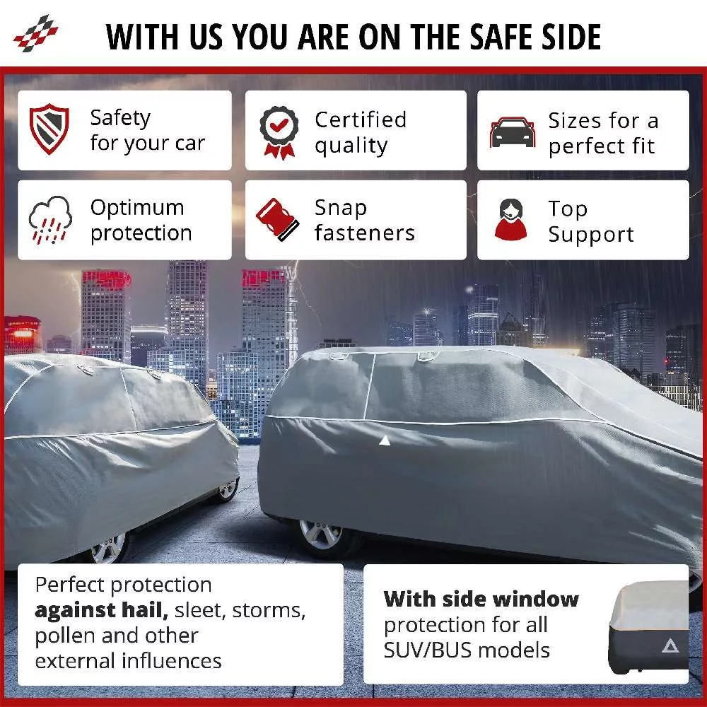 A Hybrid UV Protect jégesővédő huzat speciálisan kifejlesztett hibrid habból és kiváló minőségű 3 rétegű UV-védő membránból készül, hogy optimális védelmet nyújtson a jégeső és egyéb időjárási hatások ellen. A burkolat vastagsága összesen kb. 8 mm, amelyből a speciális hibridhab kb. 7 mm. Az anyagot több mint 500 órán át időjárási tesztnek vetették alá, így egész évben védheti autóját. Ezenkívül a fényvisszaverő élkötések és 4 fényvisszaverő biztosítja a parkoló és fedett jármű jobb láthatóságát.