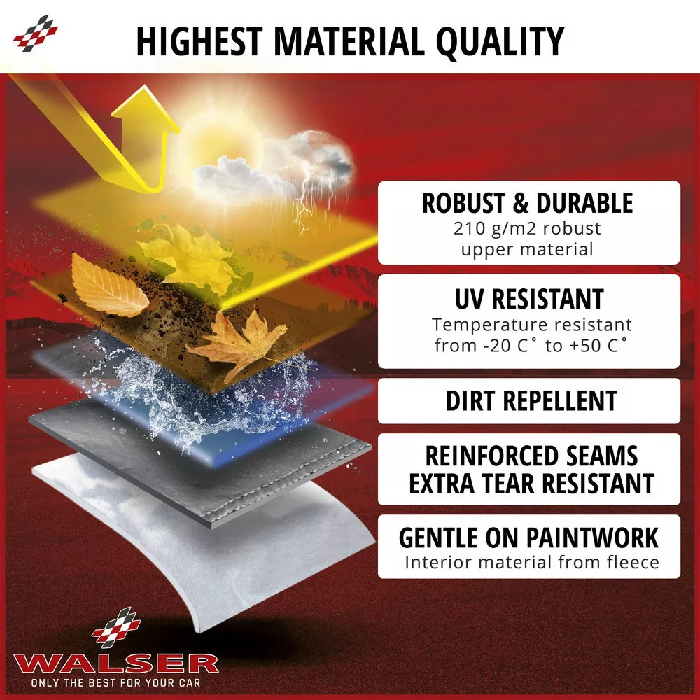 A ponyva kiváló minőségű PVC bevonatú polipamut gyapjúból készült. Ez az anyag vízállóvá és UV-állóvá teszi a terméket, ami nagy előnyt jelent, ha az autó a szabadban van. Belseje ultrapuha, festékbarát polipamut gyapjúból készült, és a lehető legjobb védelmet biztosítja járműve fényezése számára. Emiatt ez az ponyva ideális termék az Ön autójának hosszú távú védelmére az esőtől, hótól és egyéb szennyeződésektől, például portól és madárürüléktől. Beltéren is használhatja az All Weather Plus autóponyvát, ha például fél évig a garázsban parkol autója. Javasoljuk, hogy legalább kéthetente szellőztesse ki, hogy elkerülje a páralecsapódást és a penészesedést!