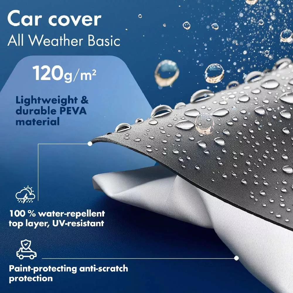 A ponyva 120 g/m²-es PEVA bevonatú, nem szőtt anyagból készült, ami vízállóvá teszi – nagy előny kültéri használatra. Ez megvédi járművét az esőtől, jégtől, hótól és egyéb szennyeződésektől, például portól, madárürüléktől, fagyantától és levelektől.