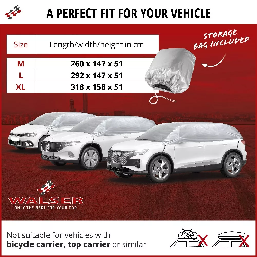 Ha nincs garázsa és minden időjárási körülmény között a szabadban kell parkolnia, az gyorsan csúnya és koszos lehet. Ennek lehető legnagyobb mértékű megelőzése és a fényezés védelme érdekében az Ön számára megfelelő terméket kínáljuk. Tökéletes védelmet nyújt a szennyeződések és az időjárás viszontagságai ellen, így járműve mindig kiváló állapotban marad. Bízzon a WALSER bevált minőségében és óvja autóját!