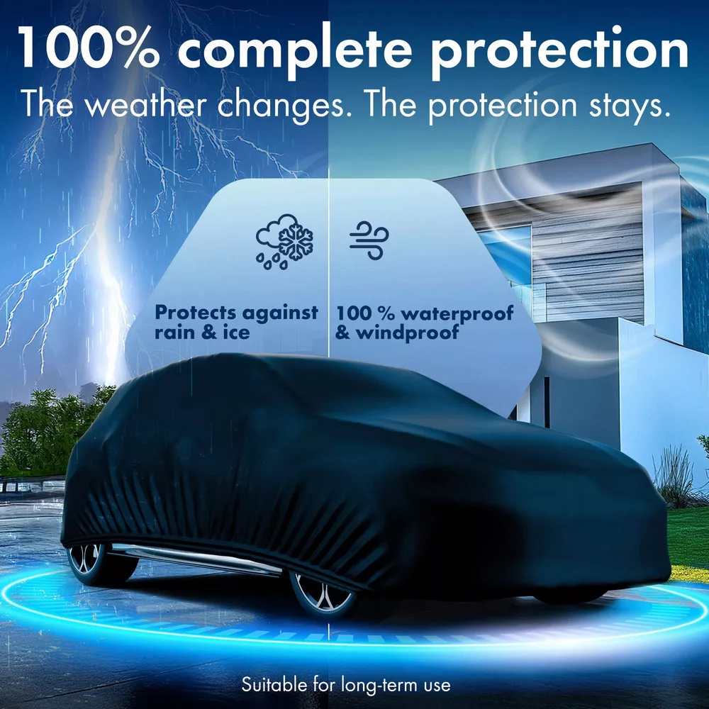 Annak érdekében, hogy bármikor ráhúzhassa autójára, az összeszerelés nagyon egyszerű. Elöl és hátul gumiszalag van bevarrva, ami megkönnyíti a ponyva felszerelését. Ezen kívül három széles rögzítőpánt található erős pattintható zárakkal, amelyek rögzítik a ponyvát a jármű alatt, és megakadályozzák annak elfújását. A speciálisan megerősített hevederrögzítés még jobb tartósságot biztosít erős szélben. Oldalt egy kis zseb található a kiálló rögzítőpánt számára, hogy ne feküdjön a koszos talajon. A termék csomagolása praktikus tárolótáskaként is szolgál. Kérjük, vegye figyelembe, hogy a burkolat alatt páralecsapódás és nedvesség képződhet, ha hosszú ideig esik erős eső, és a levegő nagyon nedves vagy a talaj nagyon nedves. Erős hőmérséklet-ingadozás esetén a burkolat alatt páralecsapódás is kialakulhat. Ez attól függetlenül megtörténik, hogy a burkolat vízálló-e vagy sem. Ezért még fontosabb, hogy rendszeresen távolítsuk el a ponyvát az autóról, szellőztessük és szárítsuk.